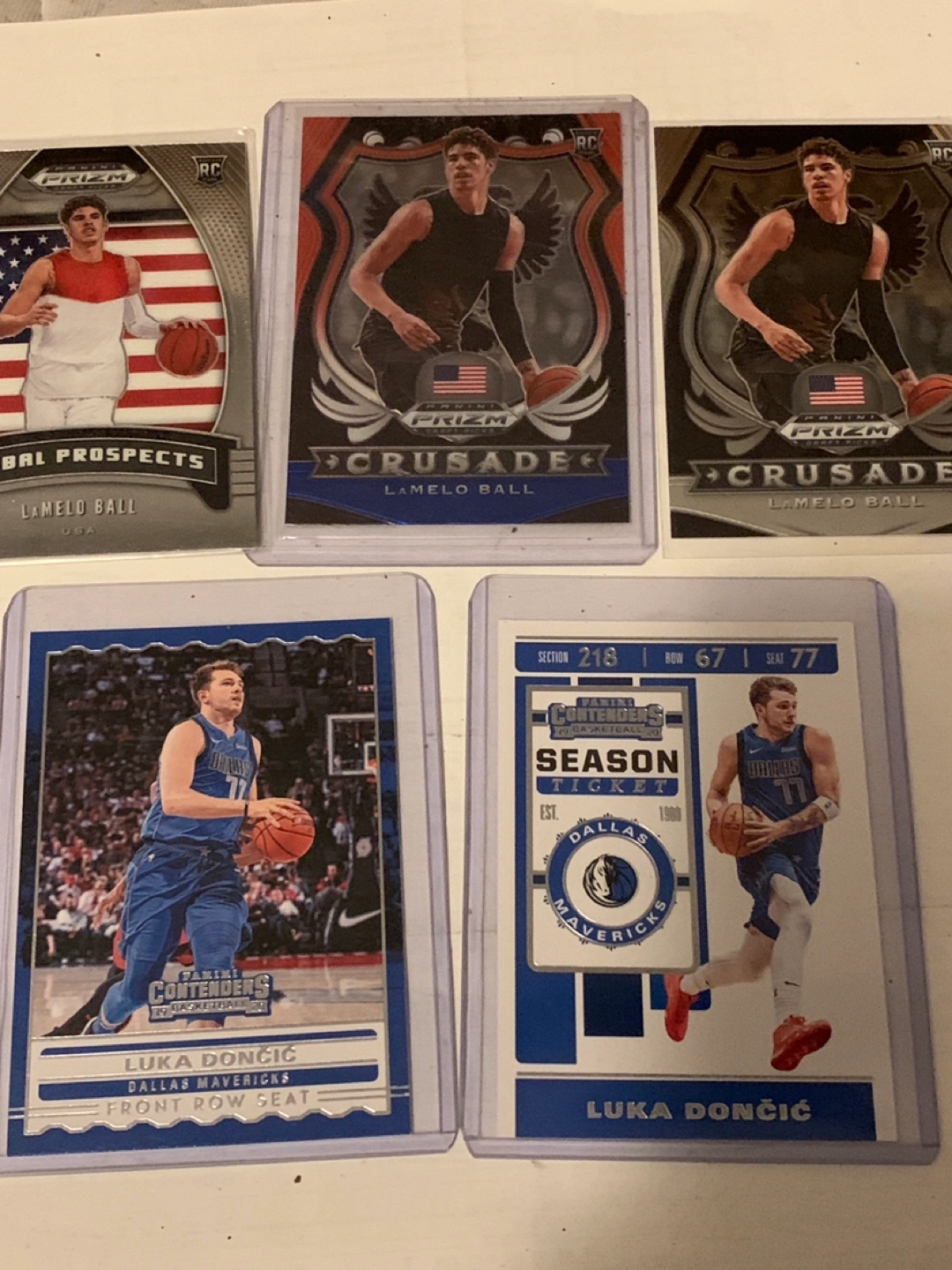 Got some basketball trading cards up for grabs! Includes Lamelo Ball Prizm cards and Luka Dončić Panini Contenders cards, perfect for any basketball fan or collector