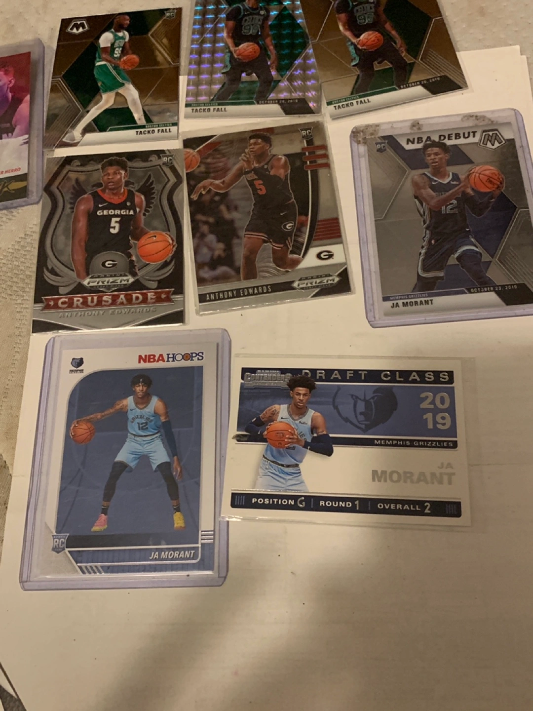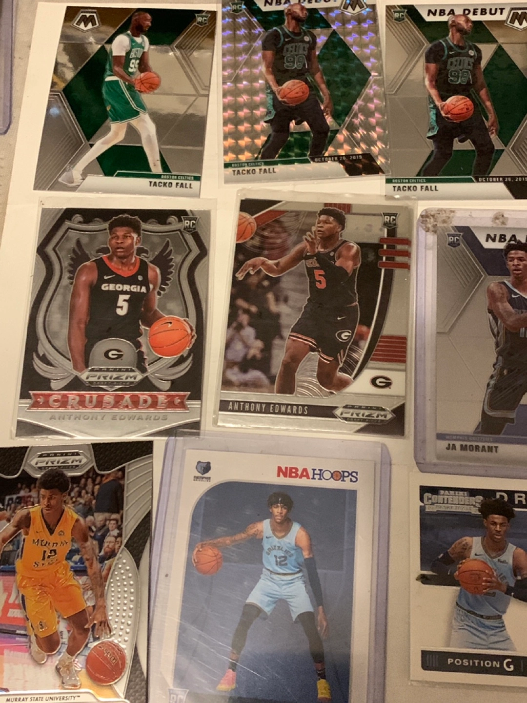 Selling a collection of rookie Ja Morant Taco Fall and Anthony Edward’s basketball cards. Includes NBA Hoops and Panini Prizm cards. Great for any basketball card collector!