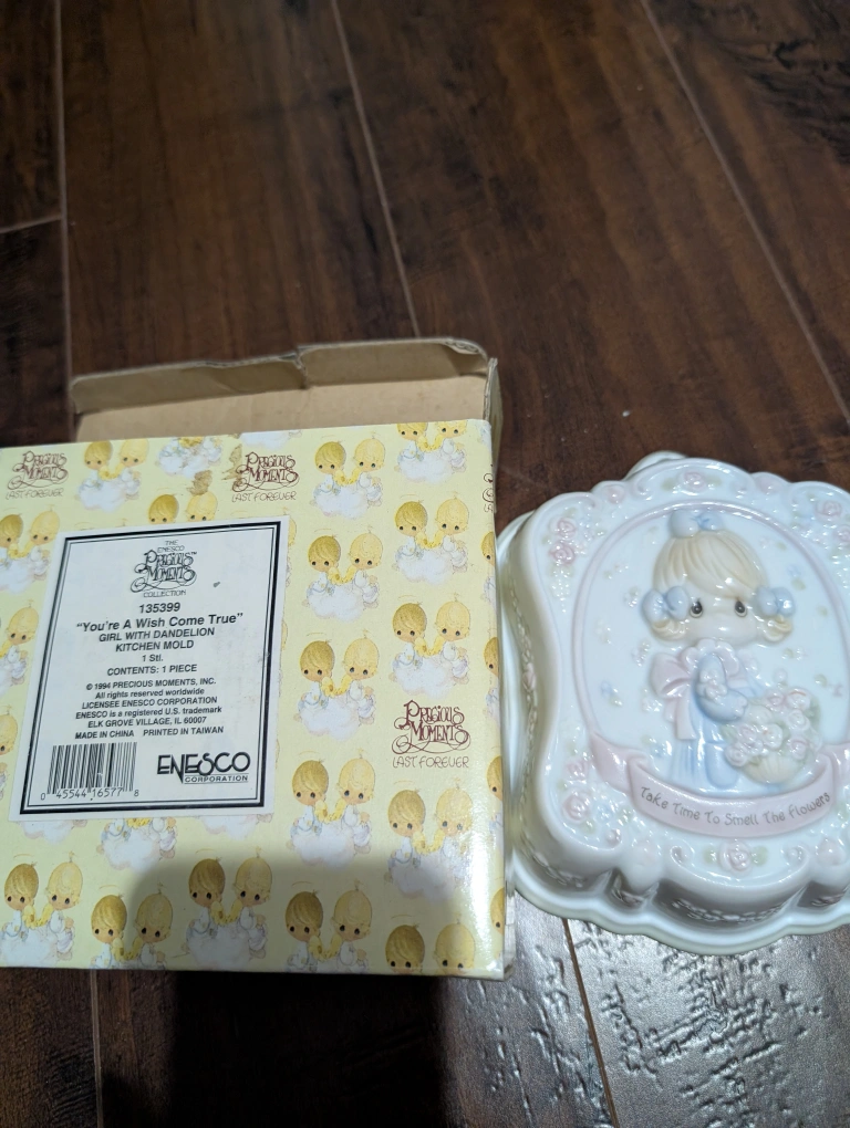 407Selling a Precious Moments "You're A Wish Come True" girl with dandelion kitchen mold. It comes with the original box