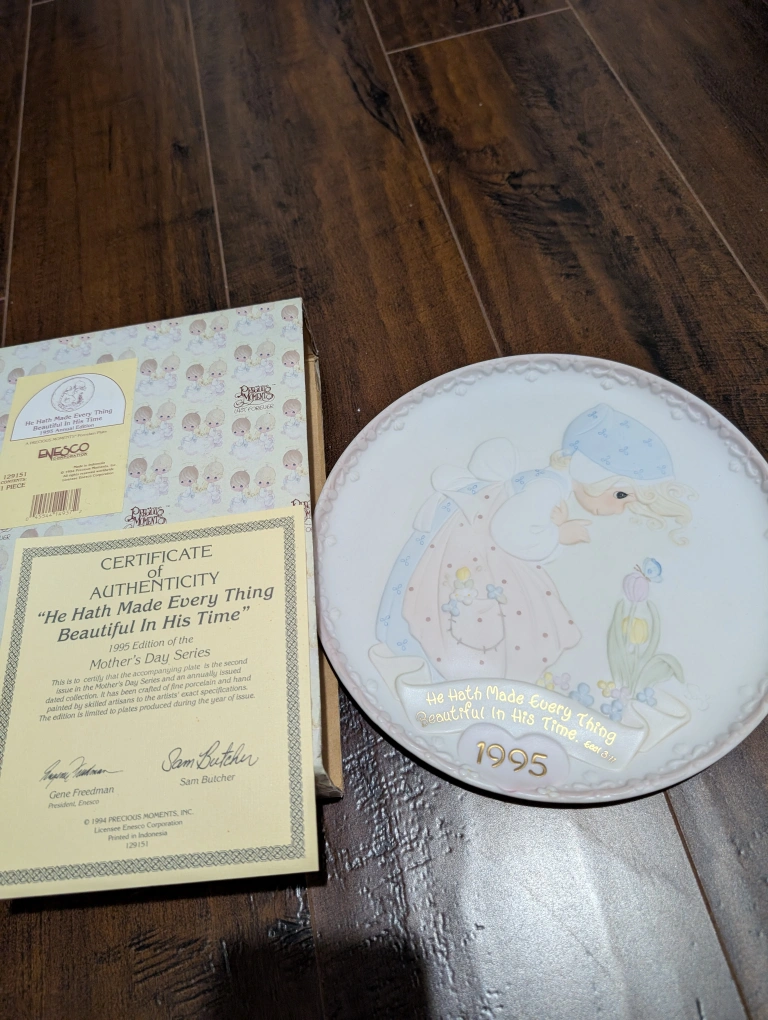 426Selling a Precious Moments collector's plate from the 1995 Mother's Day series! This plate, titled "He Hath Made Every Thing Beautiful In His Time," is crafted of fine porcelain and hand-painted. It comes with a certificate of authenticity and the original box, making it a perfect addition to any collection