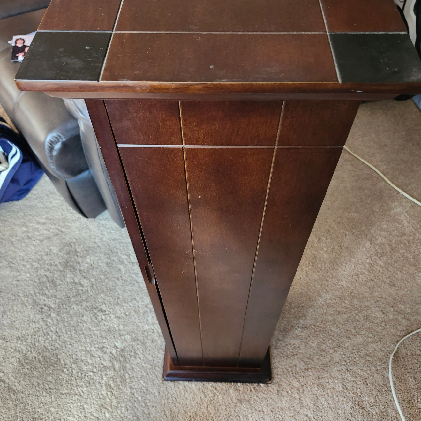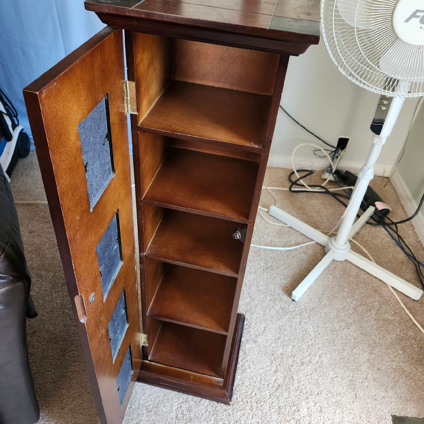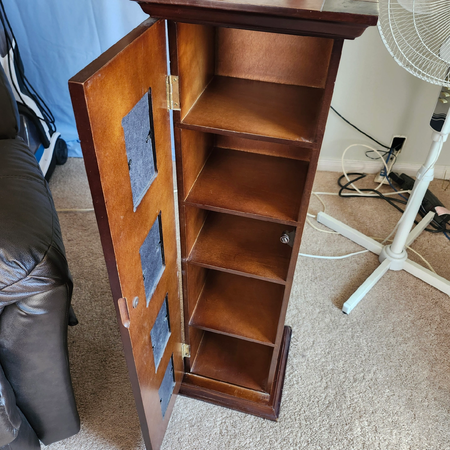 Here's a charming brown wooden storage cabinet! It features a door with picture frame inserts and several shelves inside. Great for adding a touch of practical storage to any room!