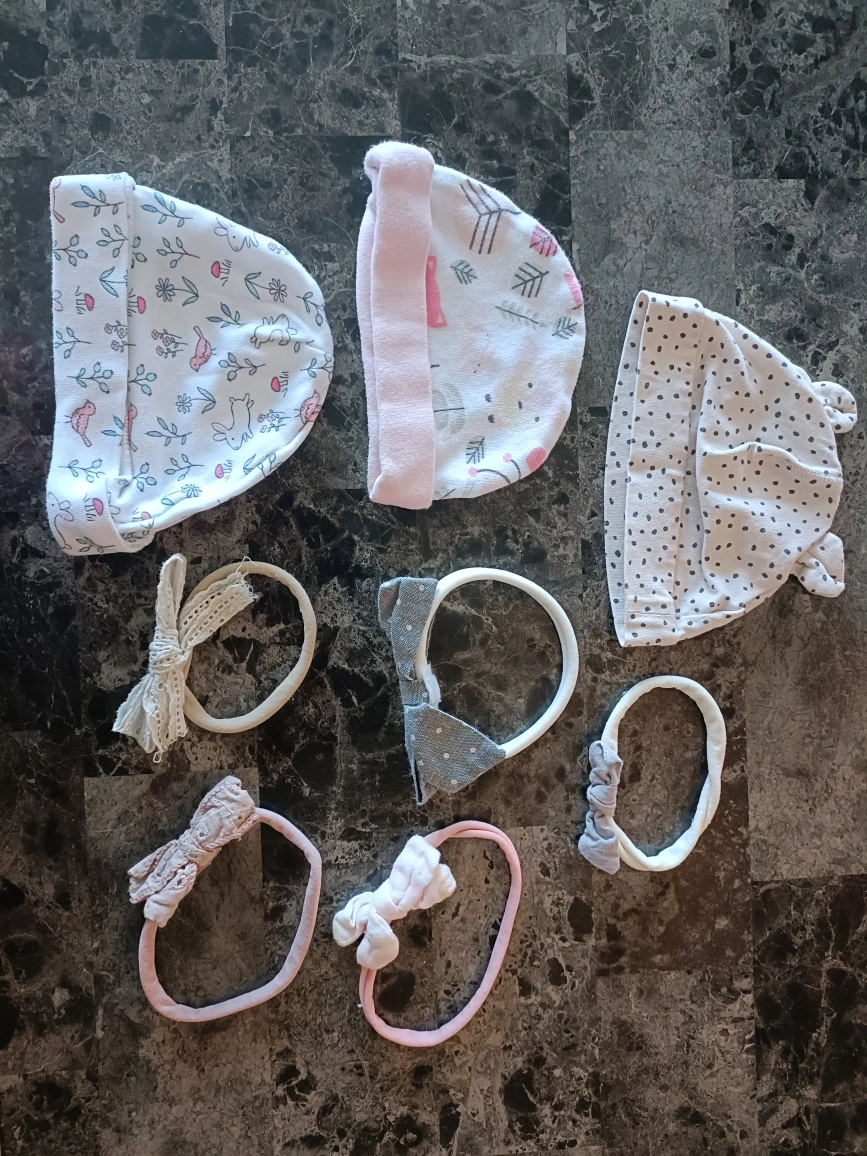 Selling a bundle of baby hats and headbands. There are three hats with different patterns and three headbands with bows. They are in good condition and ready for a new home!