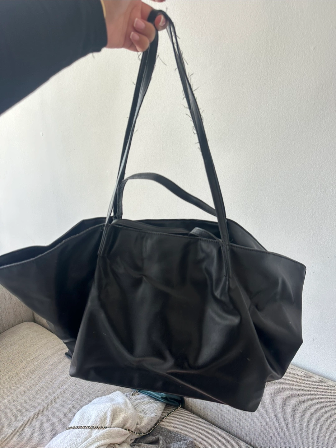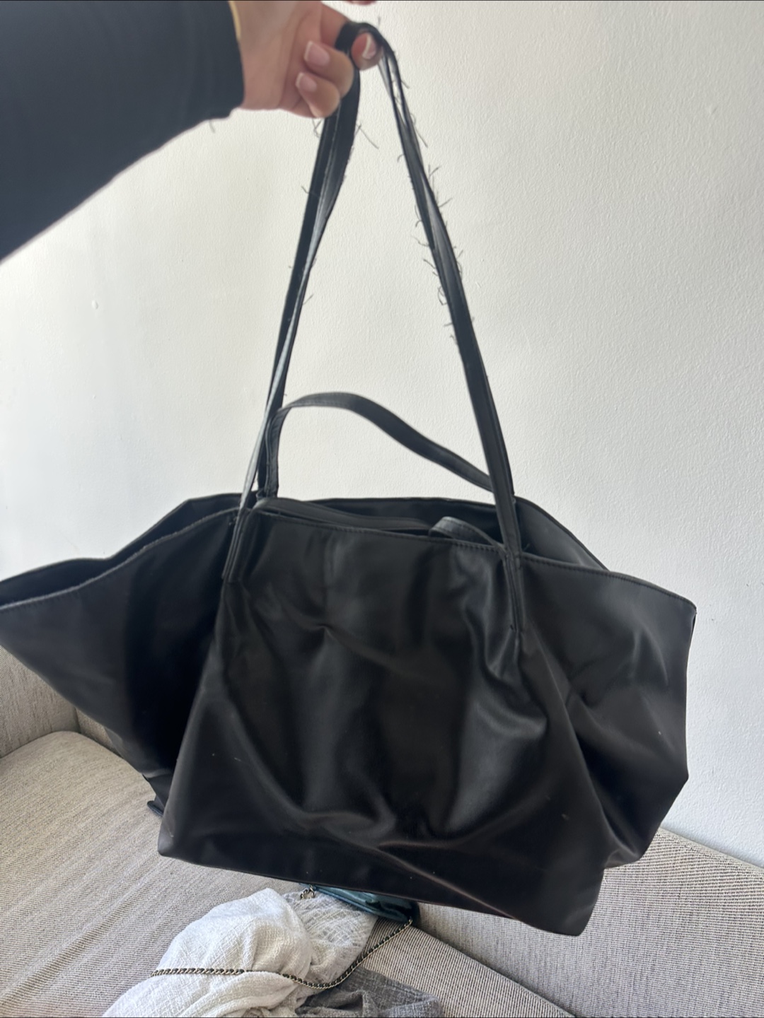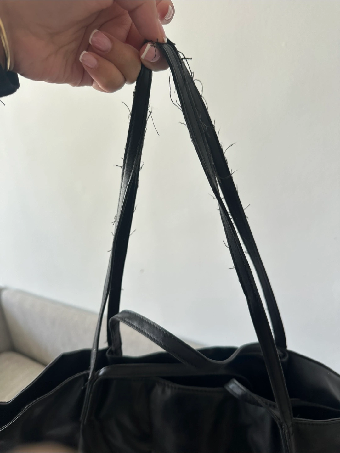 The black leather tote bag is showing signs of wear on the straps, as pictured. It's still a stylish and functional bag for everyday use!
