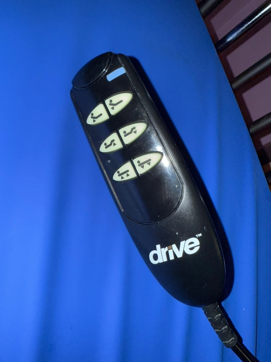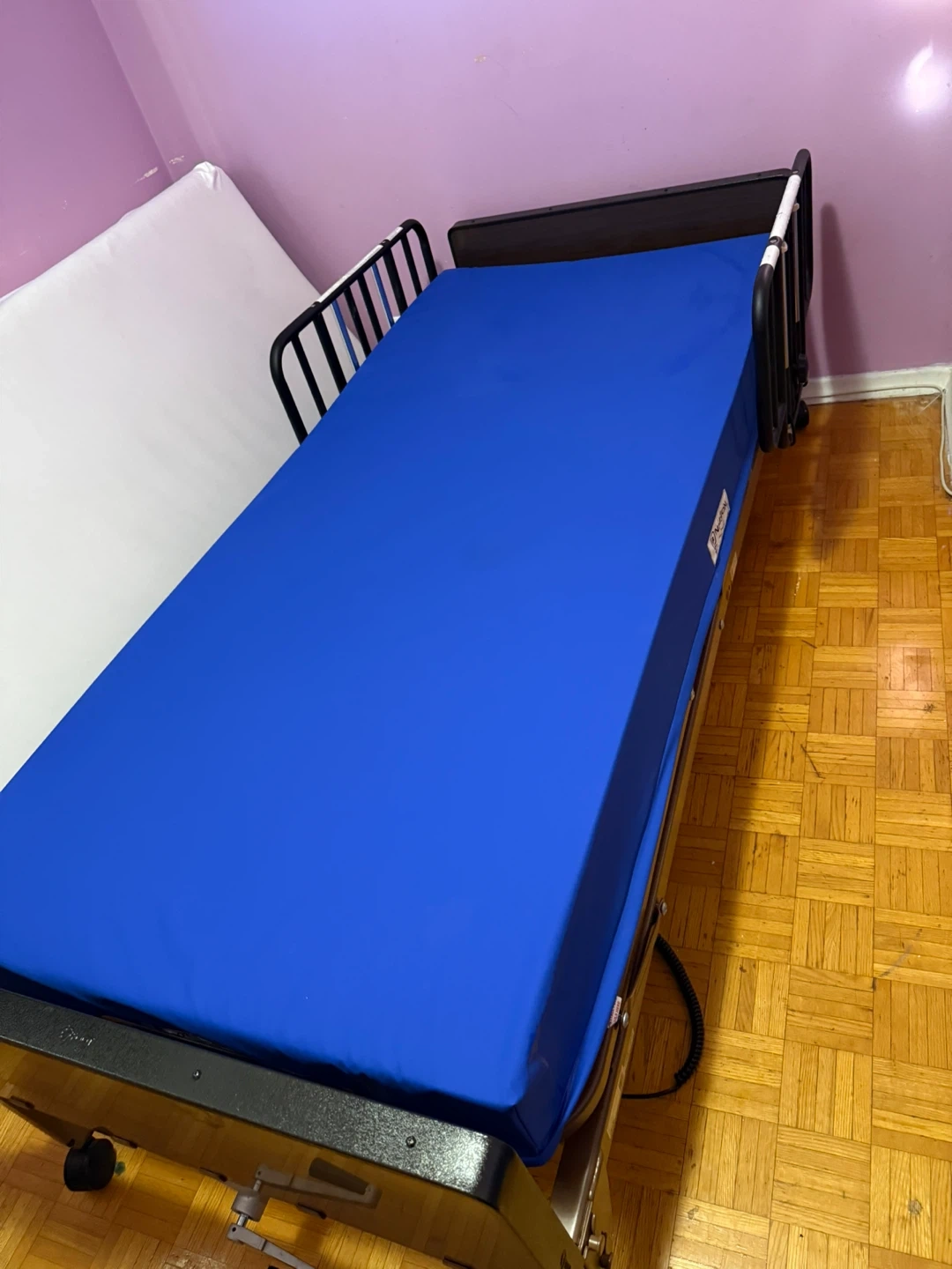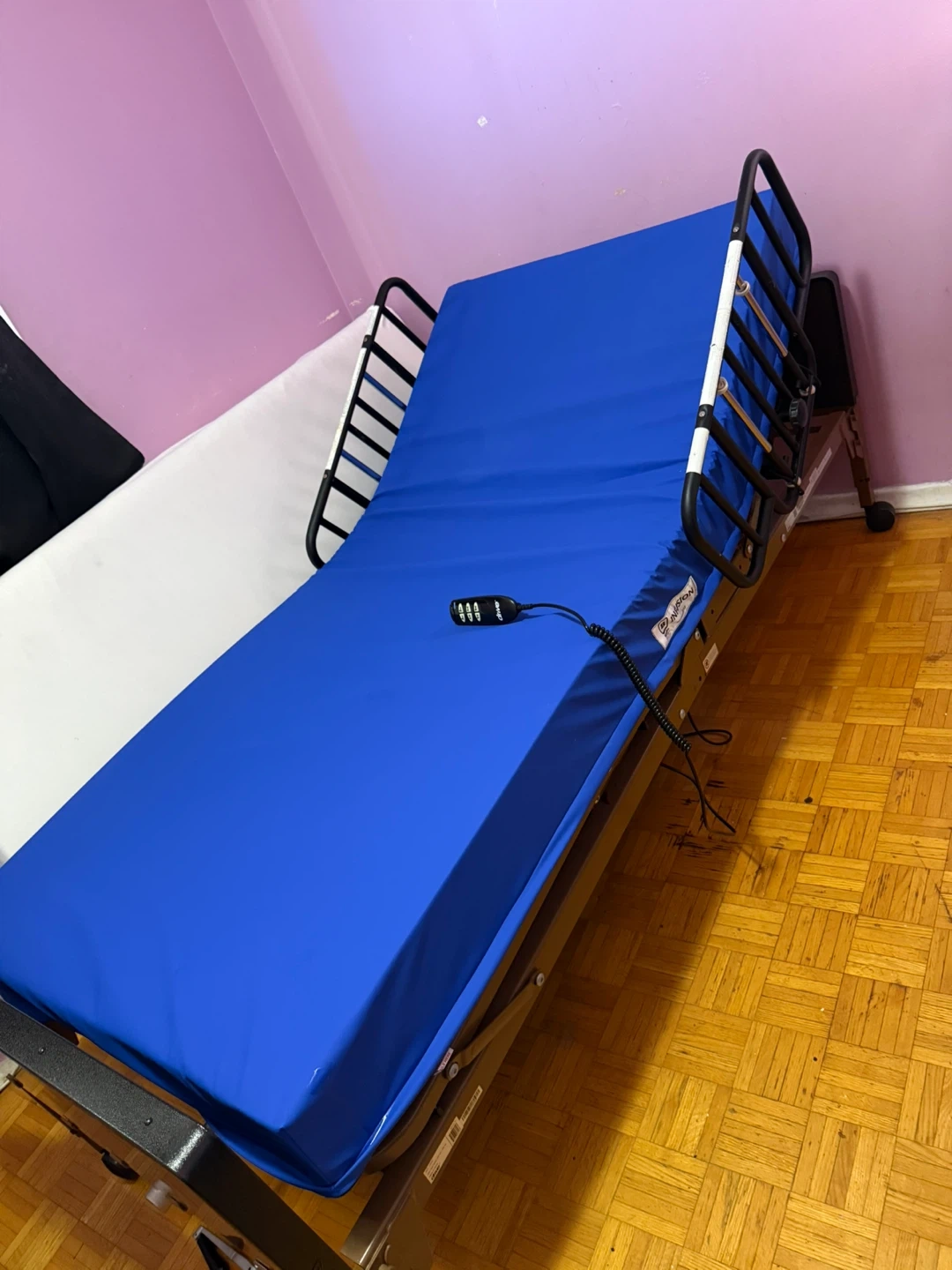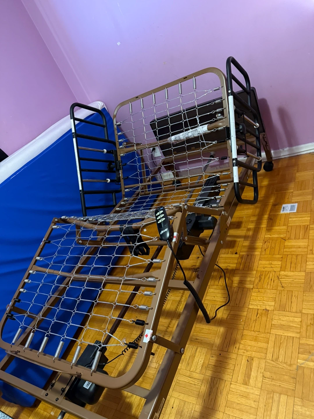 Selling a Drive Medical electric hospital bed with a blue mattress. It comes with a remote control to adjust the bed's position. Great for anyone needing an adjustable bed at home!