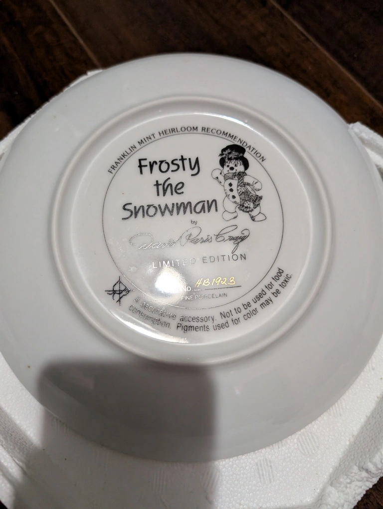 Selling a Franklin Mint "Frosty the Snowman" collector plate. It's a limited edition fine porcelain plate. The plate features a lovely illustration of Frosty the Snowman surrounded by winter animals and scenery. A great addition to any collection!