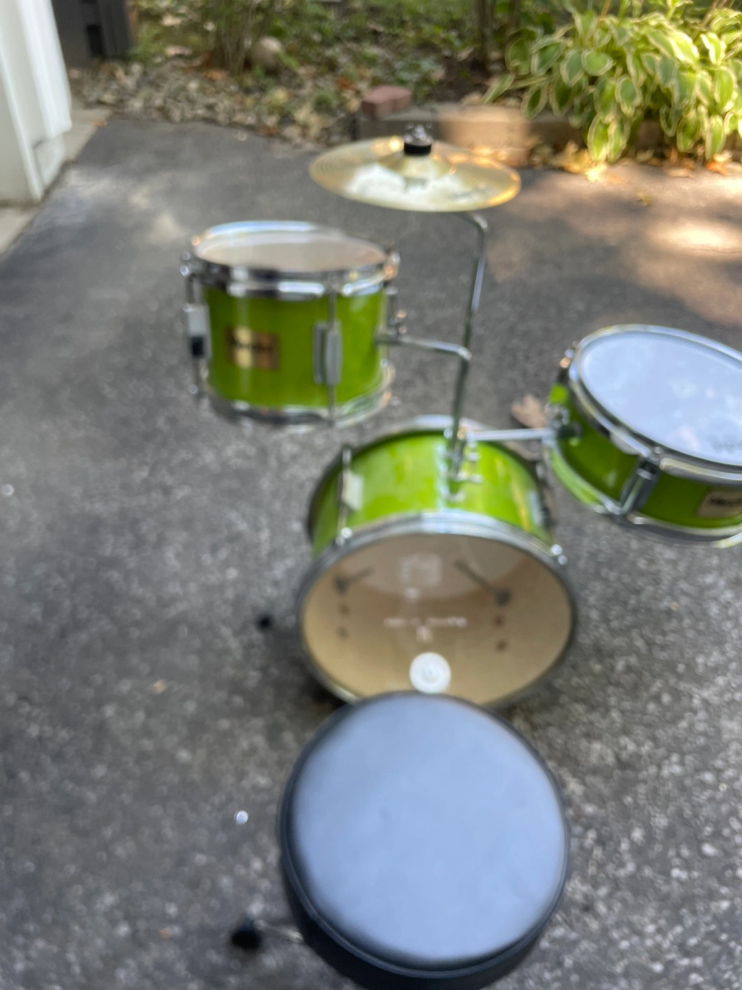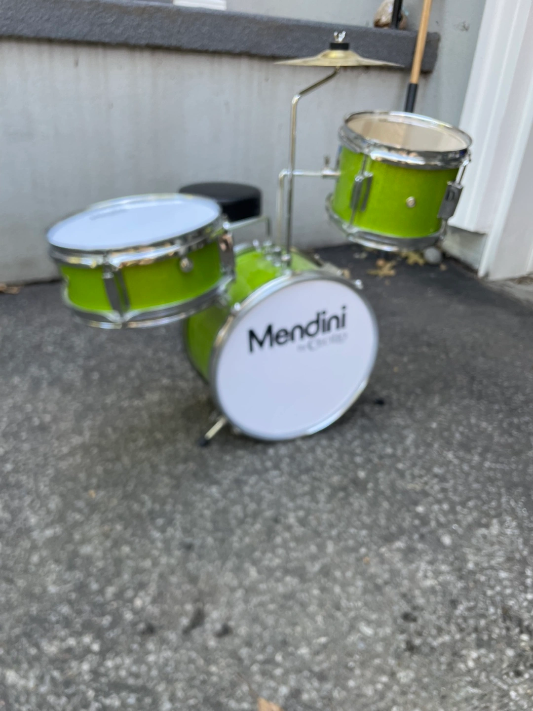 Selling a cute Mendini kids drum set in green! It's a great way to introduce your little one to music. This set includes a bass drum, snare drum, tom-tom drum, cymbal, and a stool. Perfect for beginner musicians