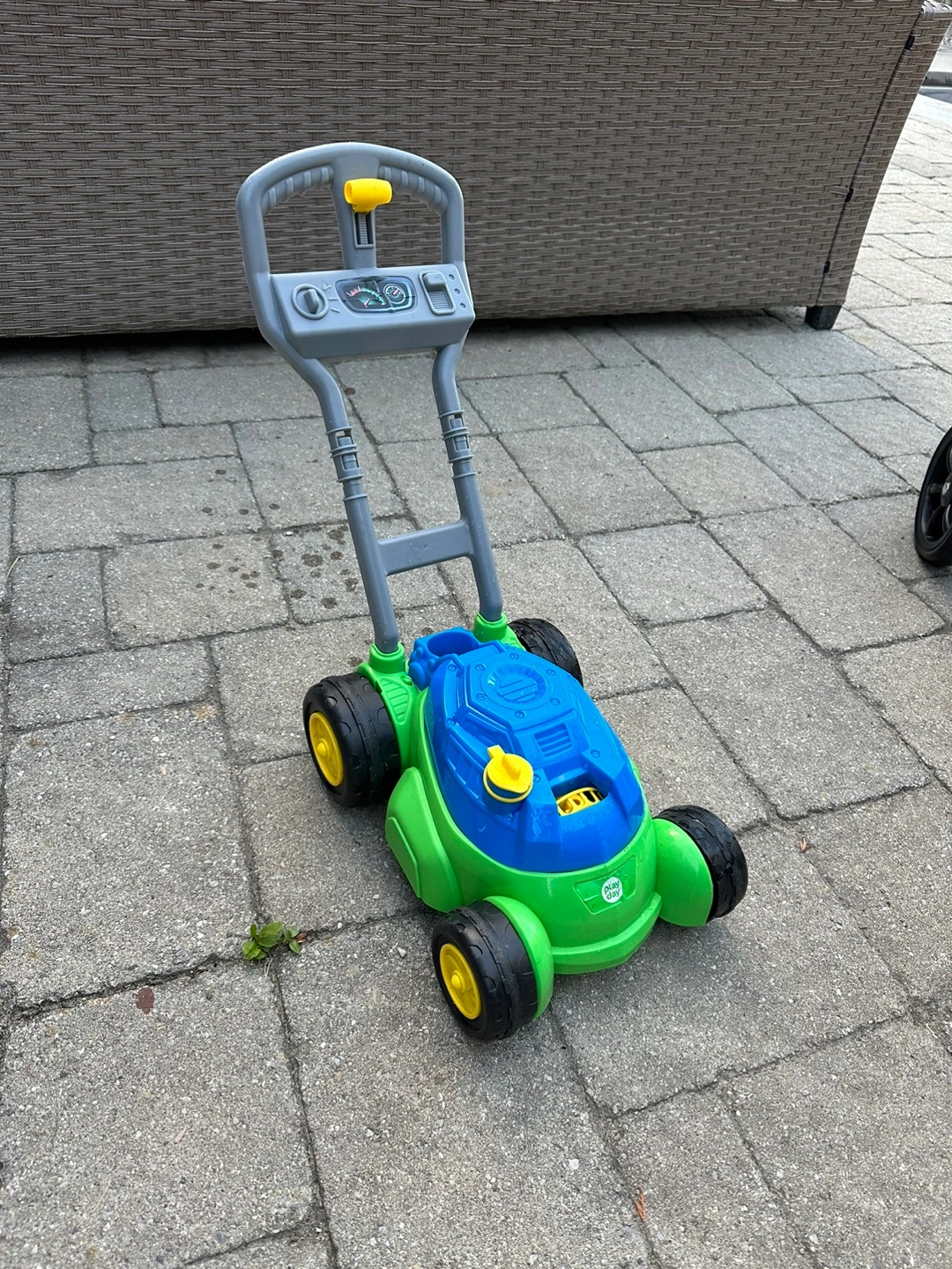 Selling a Play Day toy lawn mower bubble blower for kids! It's in great shape and ready for some fun in the yard. The colours are a vibrant green and blue, perfect for little ones who love to mimic grown-up chores. It's lightweight and easy to push around, making it ideal for toddlers and young children