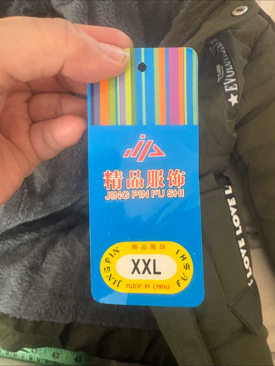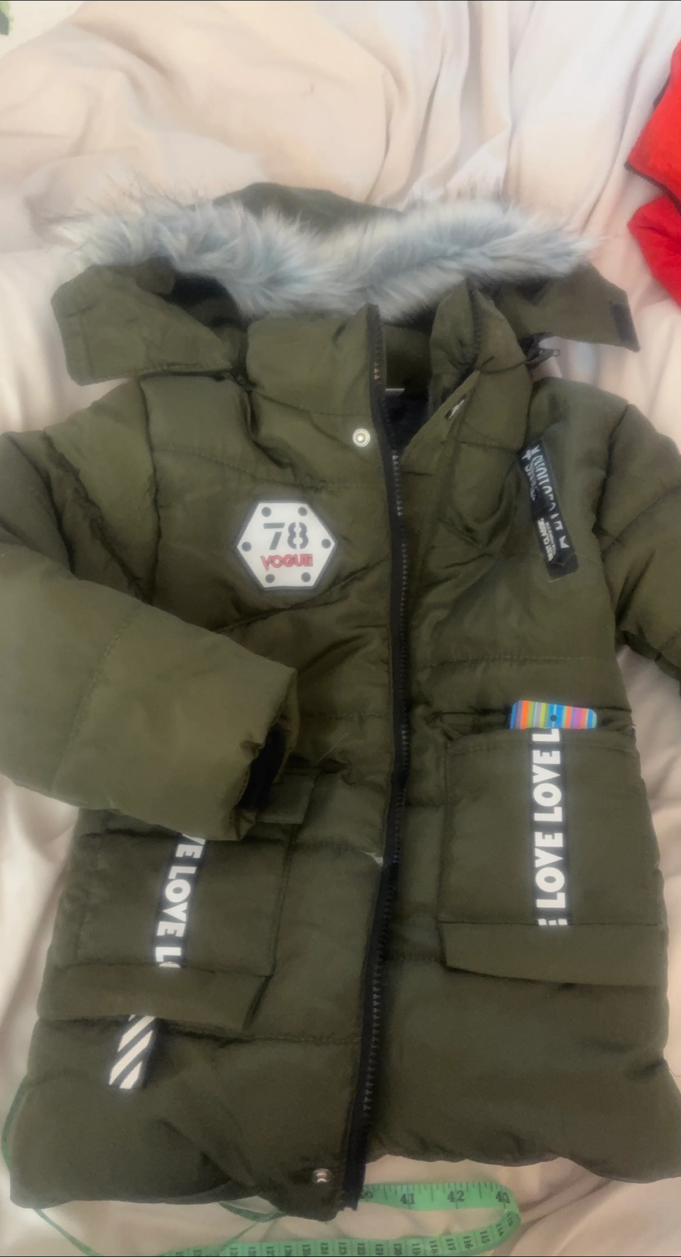Here's a cozy olive green puffer jacket, perfect for keeping warm! It features a faux fur-trimmed hood and fun 'LOVE LOVE' detailing on the pockets.