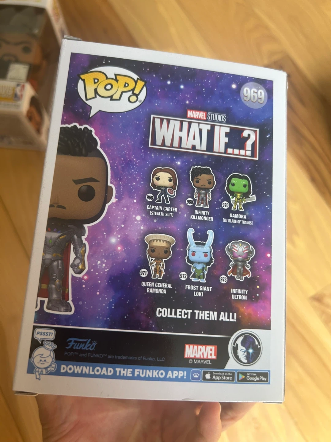 Selling a Funko Pop! figure of Infinity Killmonger from the Marvel Studios series "What If...?" It's number 969 in the Pop! series. This bobble-head figure is still in its original packaging, ready for a new home!