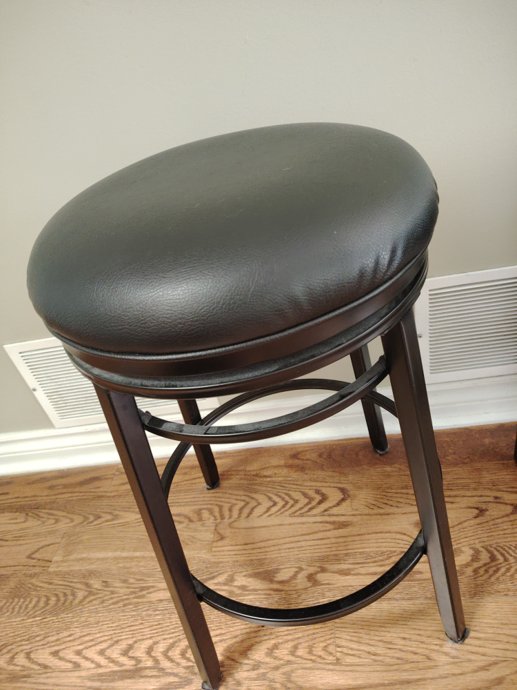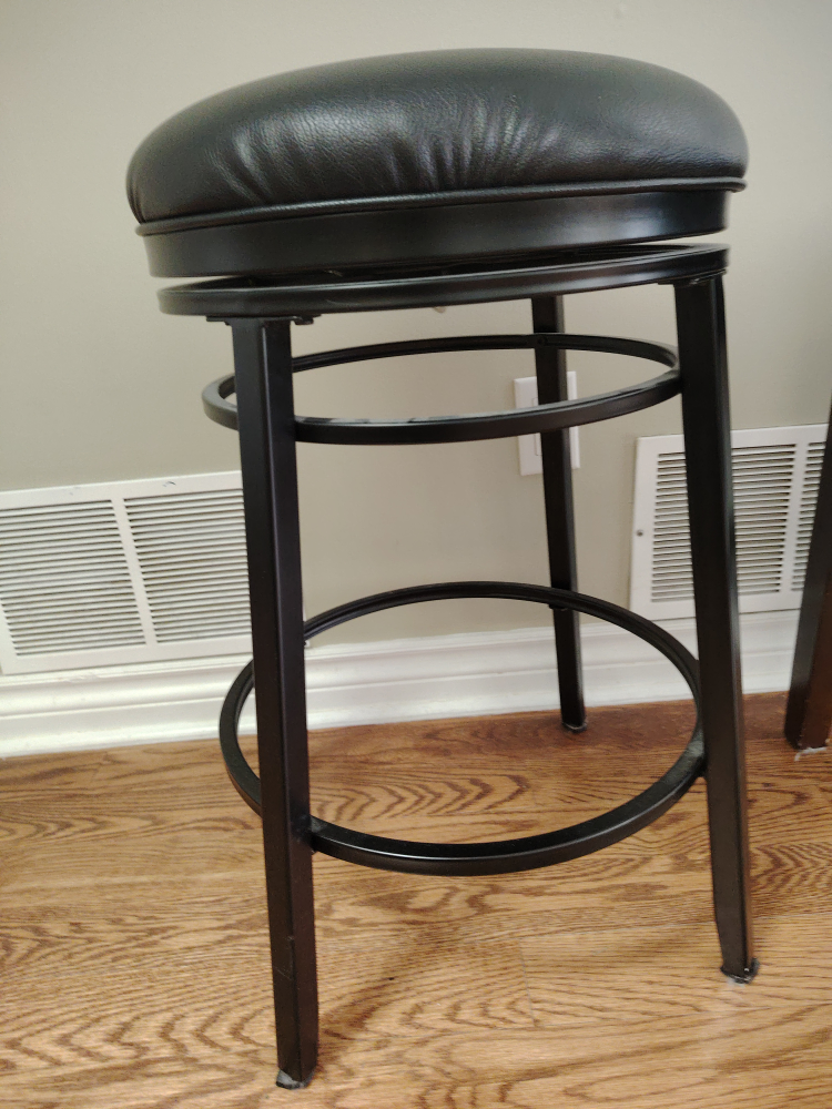 Here's a comfy black swivel bar stool! It's got a padded seat and a sturdy metal frame. It would be perfect for your kitchen island or home bar. It's in great condition and ready for a new home