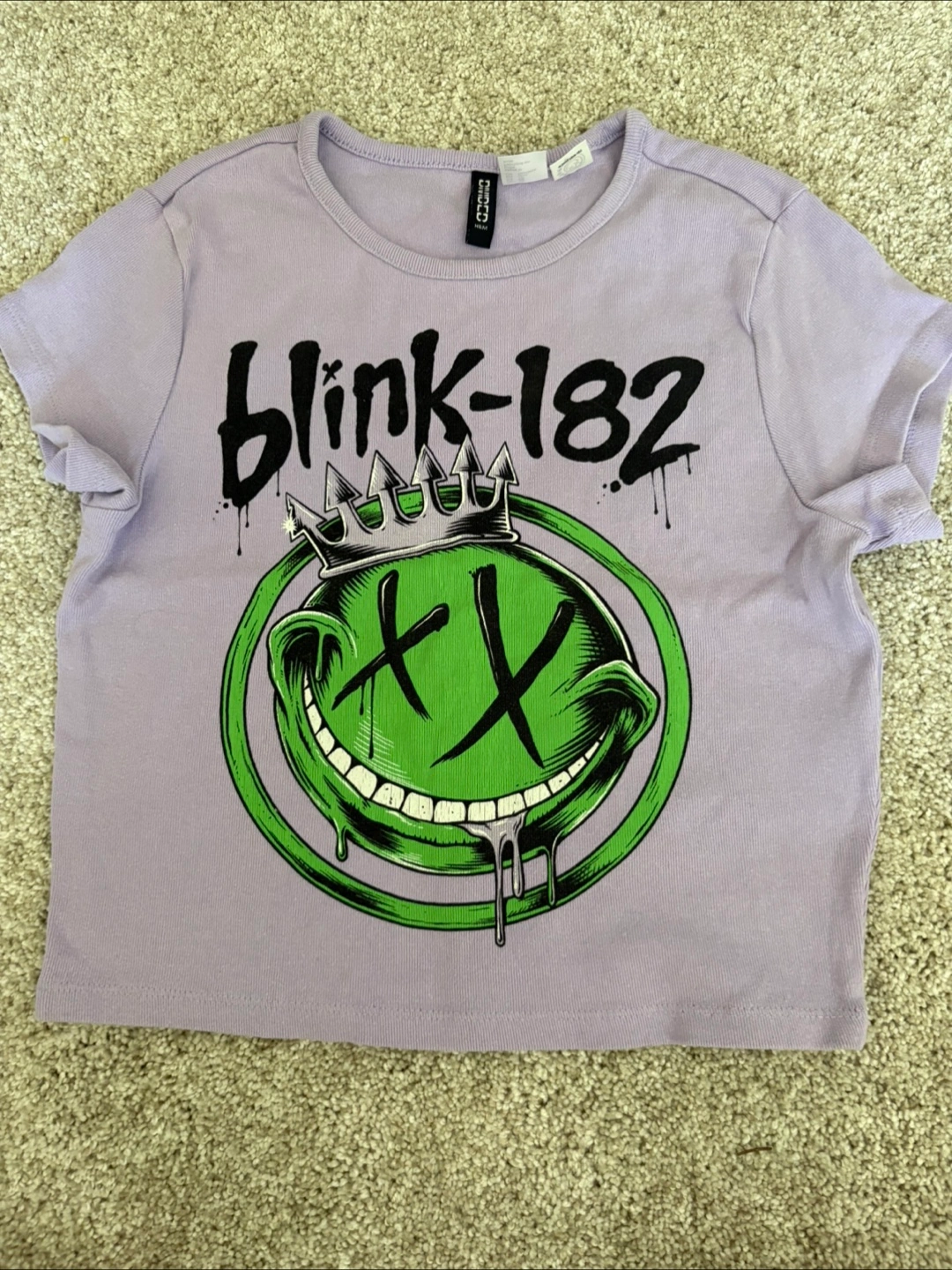Cute H&M t-shirt featuring a Blink-182 graphic! It's a light purple colour and in great condition. Perfect for any fan!