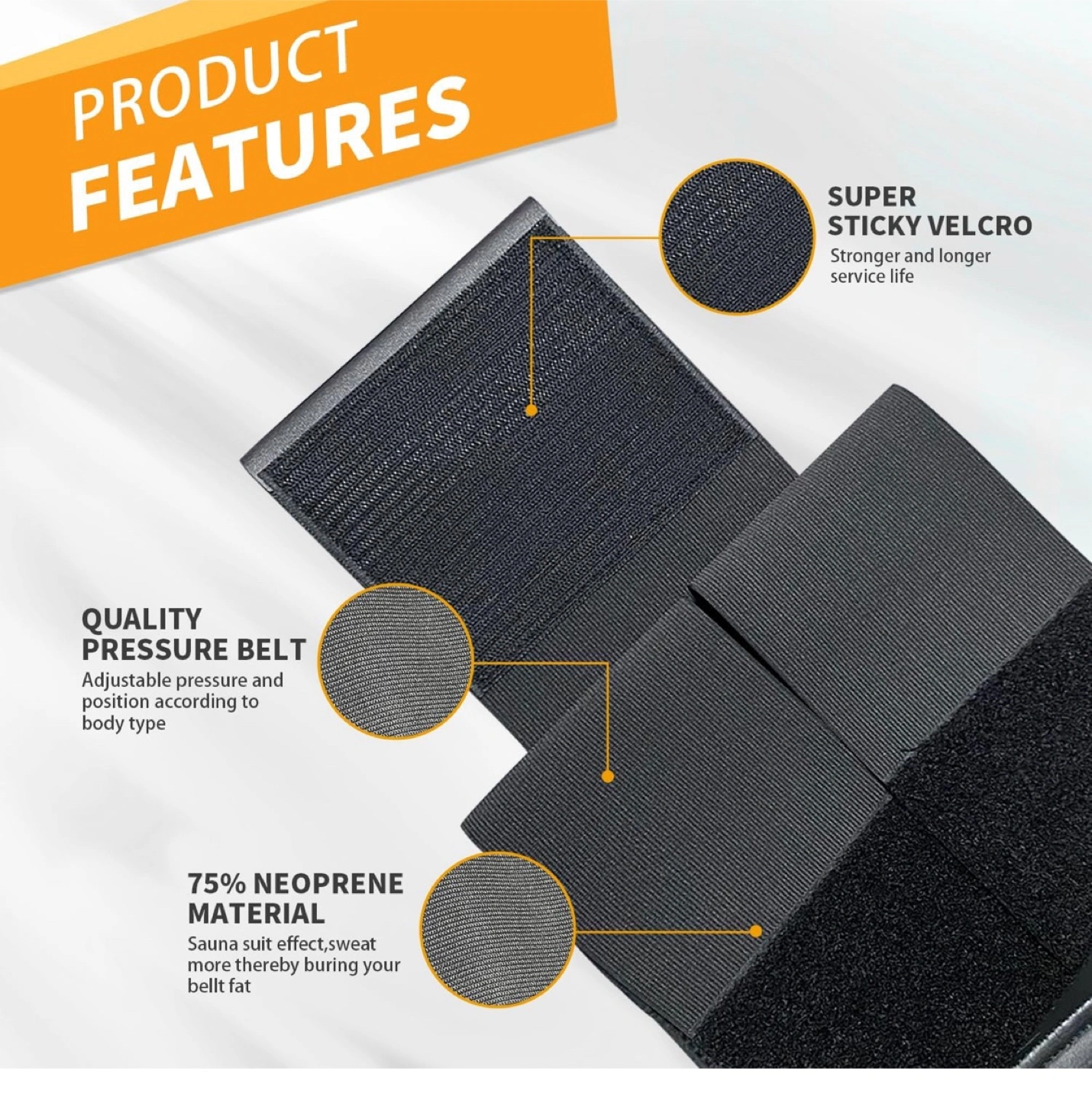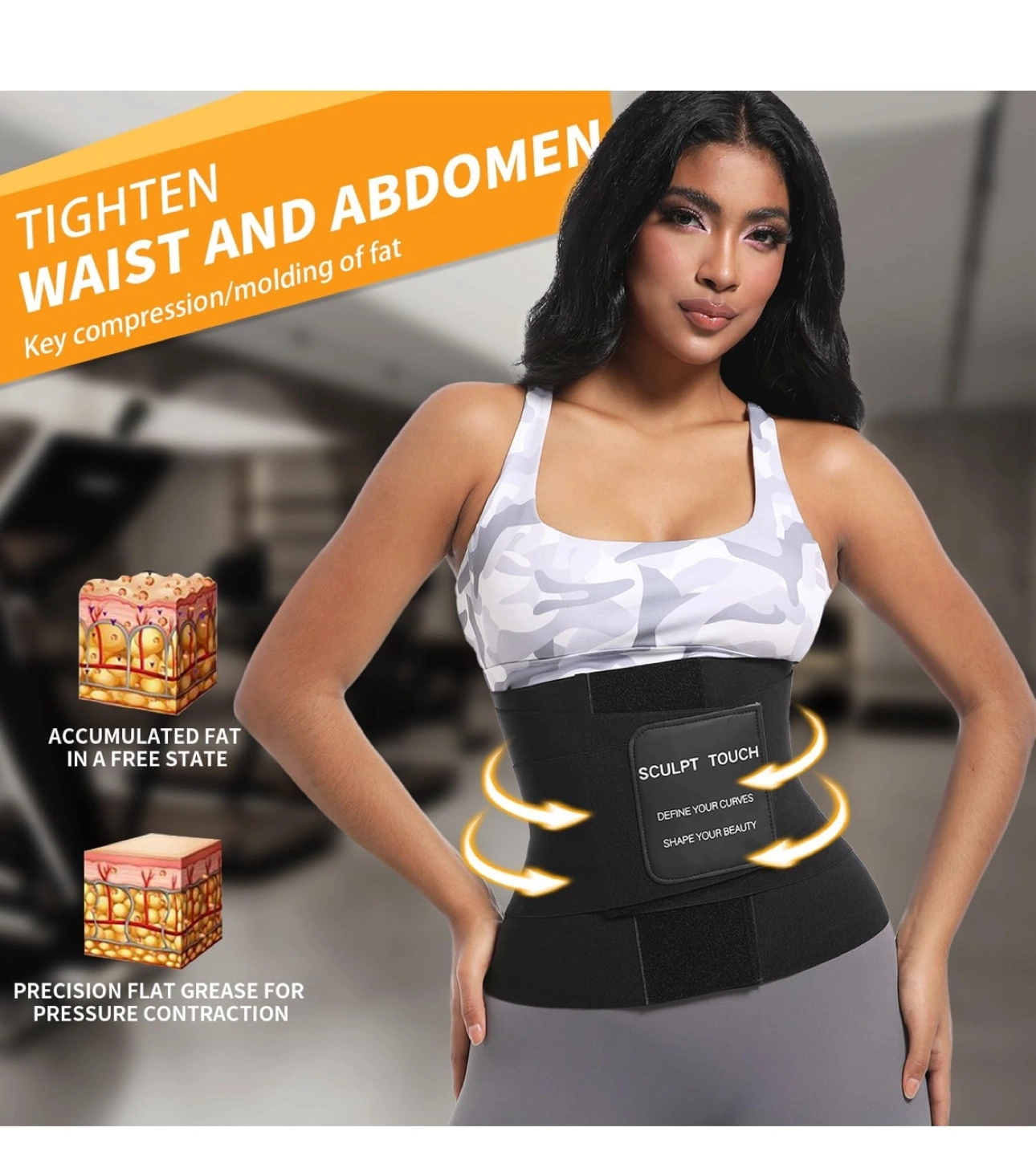 I'm selling a Sculpt Touch waist trainer in size M. It's made with 75% neoprene material and features super sticky velcro for a secure fit. The quality pressure belt is adjustable to your body type. It's designed to tighten the waist and abdomen, providing key compression and molding. The material is 30% spandex and 70% polyester