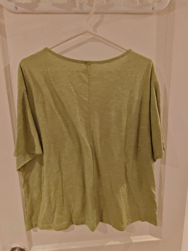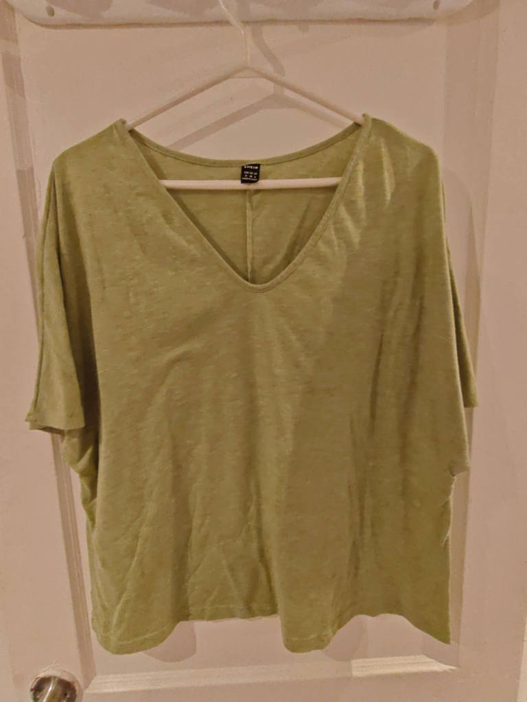Selling a green V-neck t-shirt in size M. It's in great condition and ready for a new home. The material is lightweight and comfortable, perfect for everyday wear. It's a stylish and versatile piece to add to your wardrobe!