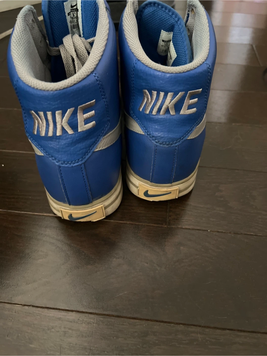 Selling a pair of blue Nike high-top sneakers! They show some signs of wear, but still have lots of life left in them. Perfect for casual wear or hitting the court for a game of basketball. Check out the photos for a closer look!