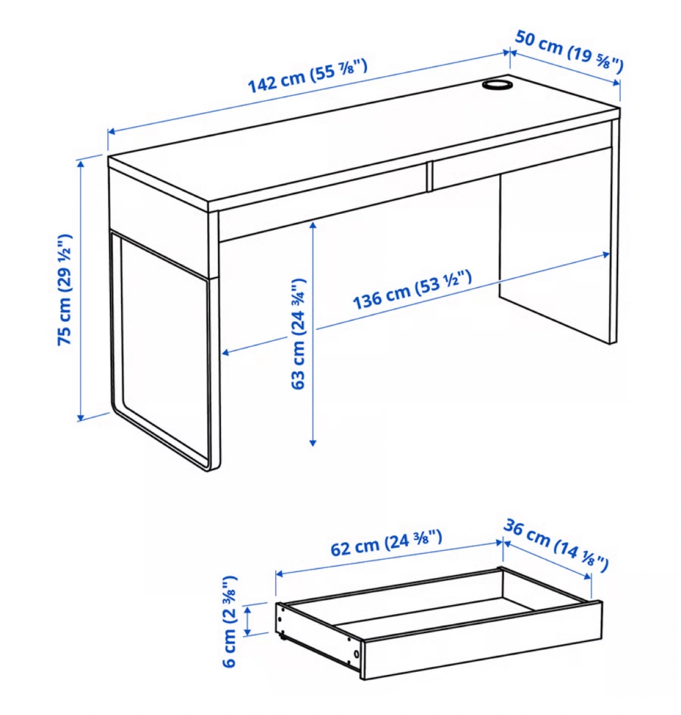 The desk measures 142 cm in length, 50 cm in width, and 75 cm in height :)