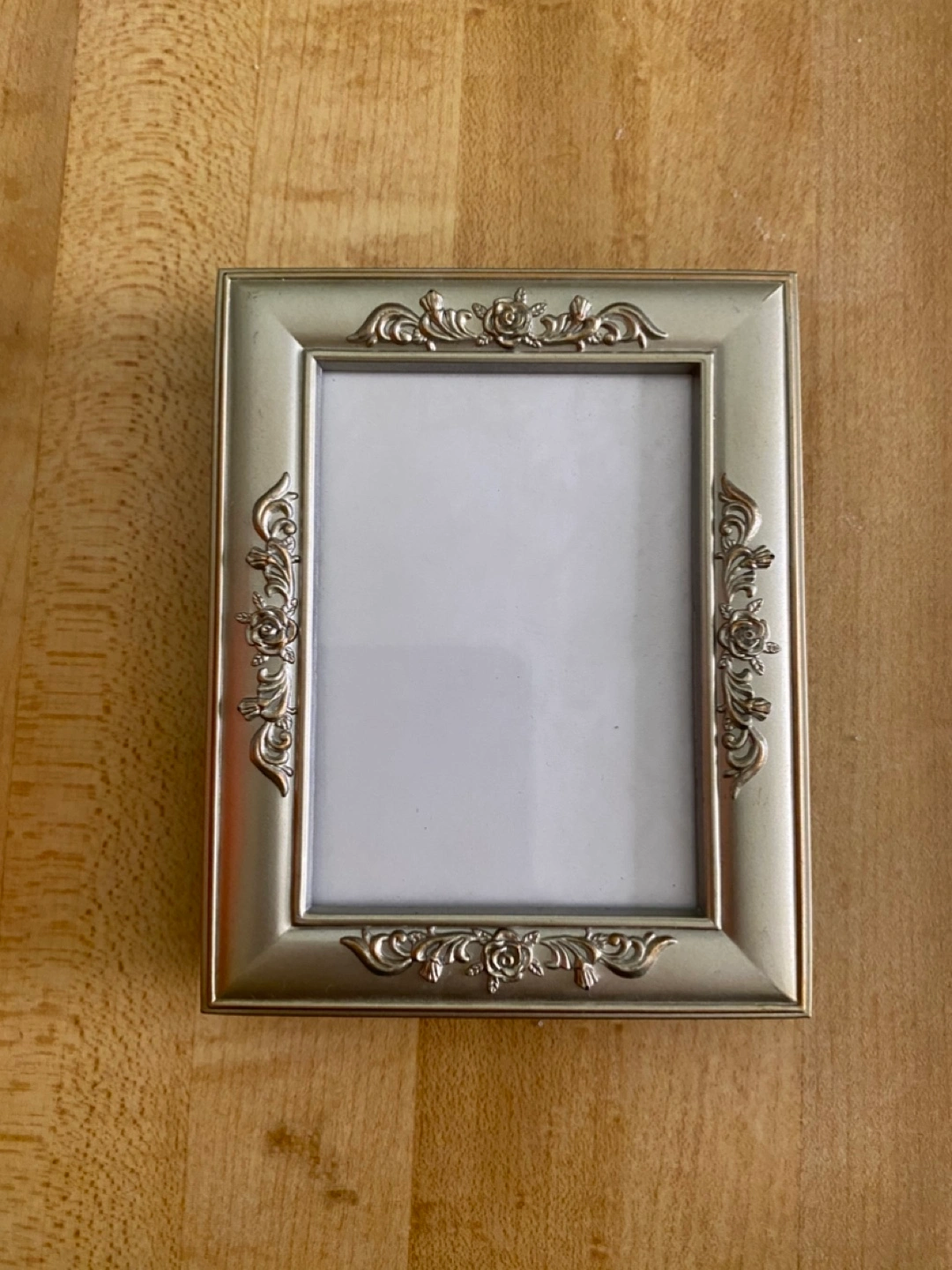 Cute vintage silver-tone picture frame, holds a 2.5” wide x 3” high photo. Pick up only in the Trinity Bellwoods area, cash only