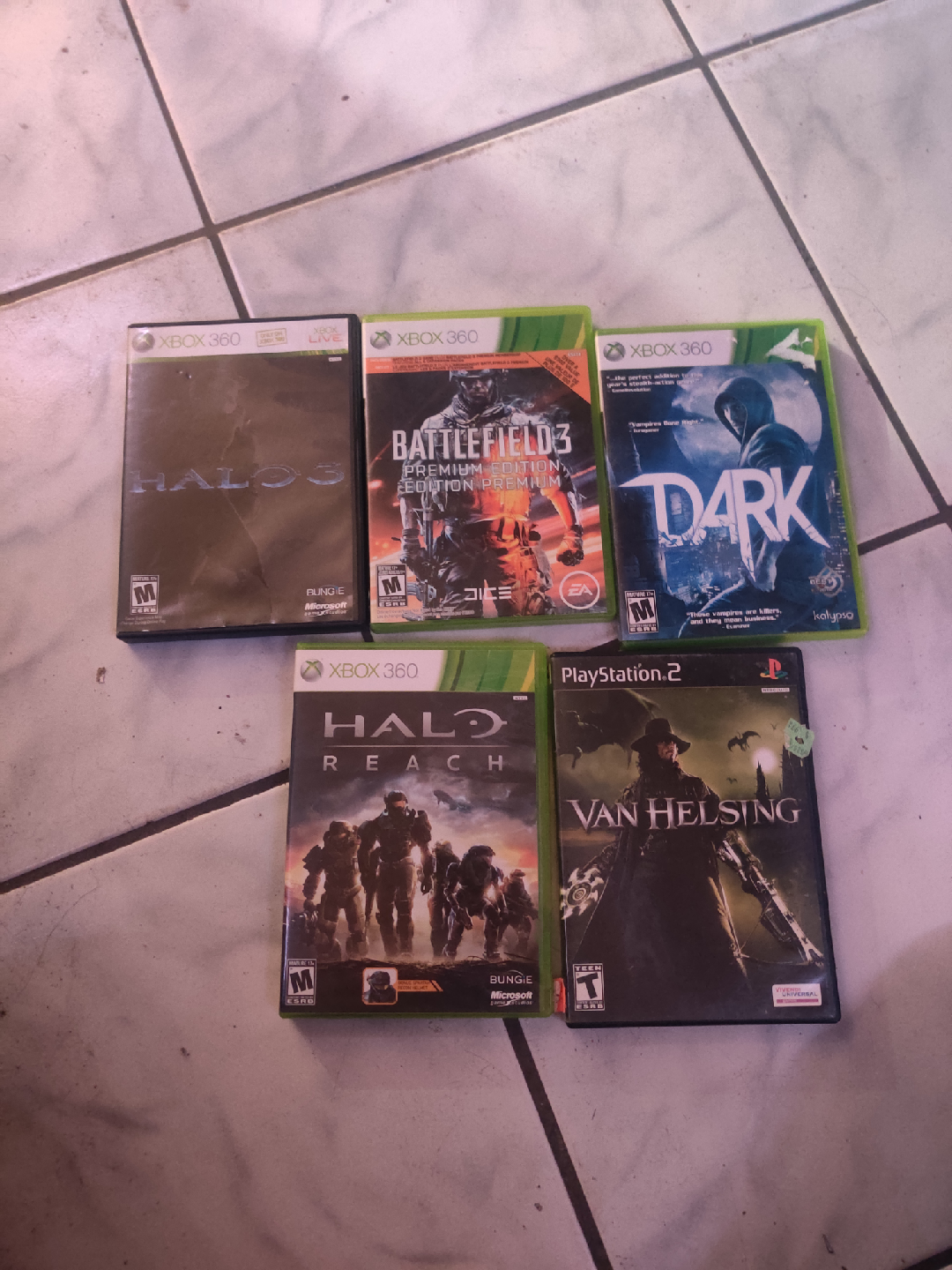 Selling a bundle of Xbox 360 and Playstation 2 games. Includes Halo 3, Battlefield 3 Premium Edition, Dark, Halo Reach, and Van Helsing. All games are in good condition and ready to play!