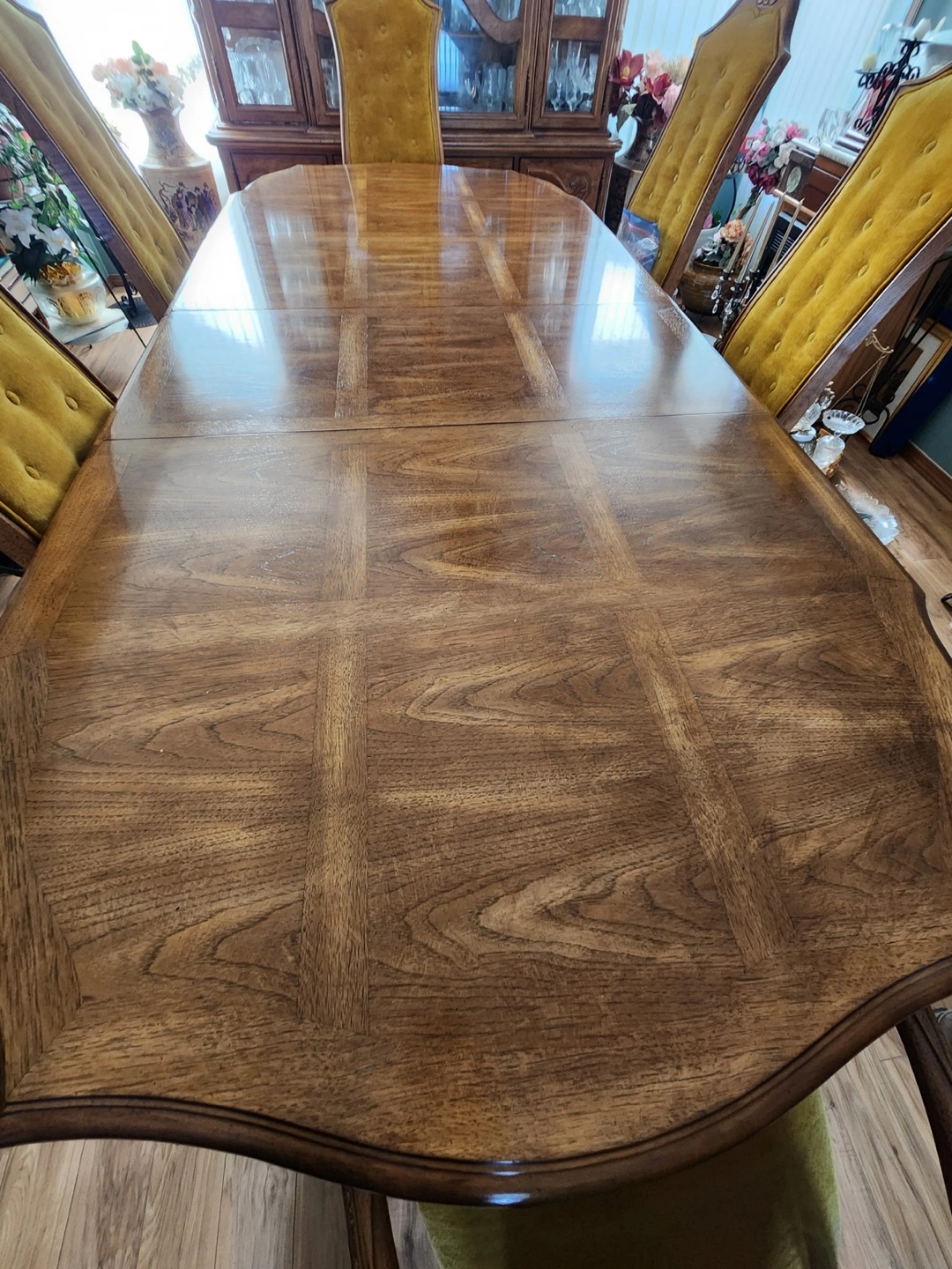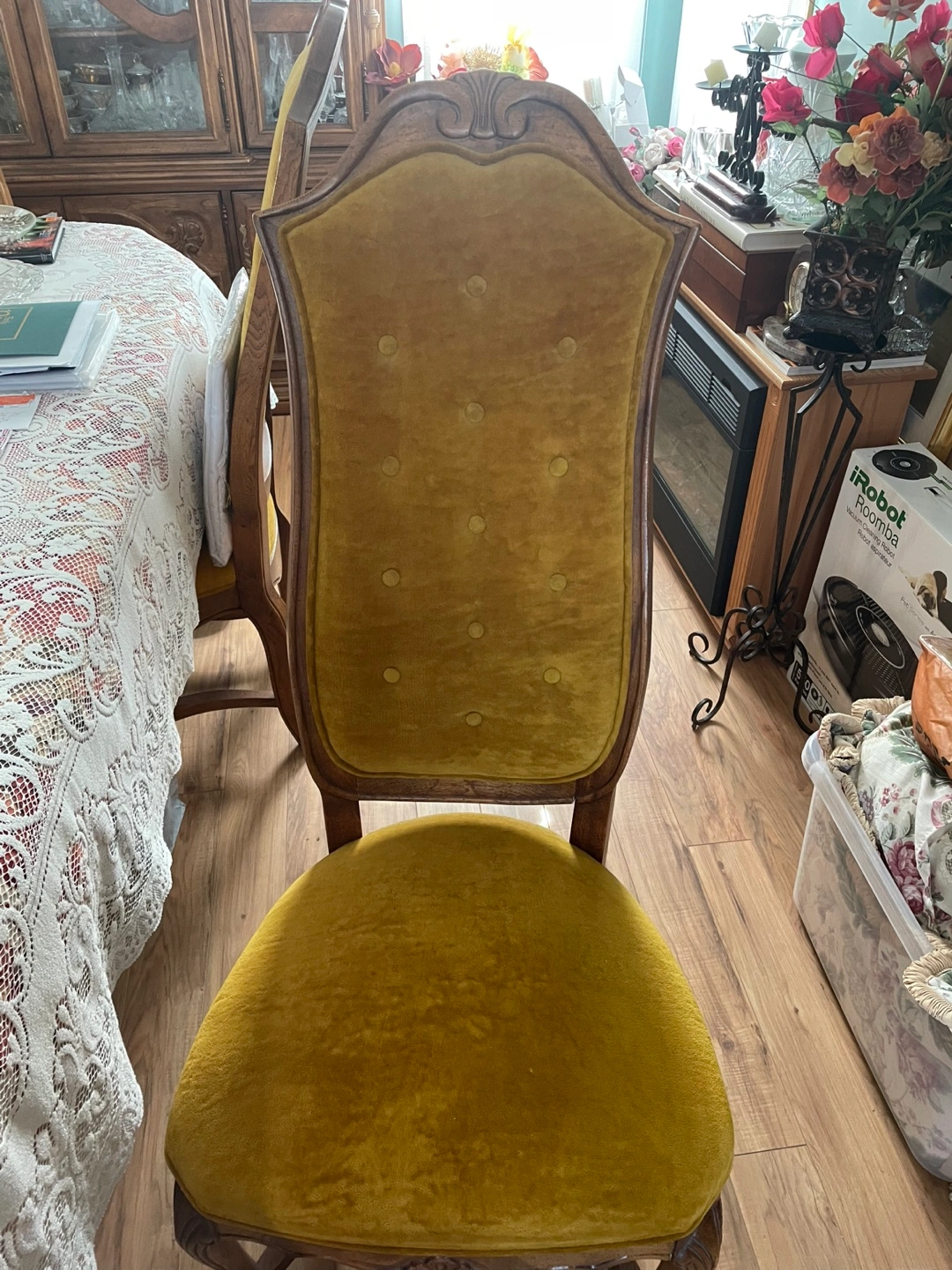 Selling a beautiful vintage dining set that includes a large dining table, six chairs with yellow velvet upholstery, and a matching china cabinet or hutch. The set has a classic, ornate design and is made of wood with a rich, dark finish. It would be a lovely addition to any dining room!also comes with a extra leaf to make the table even bigger for bigger family gatherings price can be negotiated cash only no e-transfers thank you