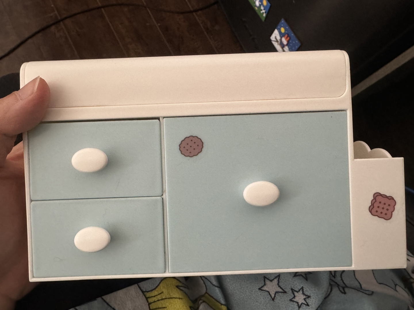 Super cute mini drawer storage box! It's perfect for storing small items like stationery, jewelry, or makeup. The box has a lovely pastel colour scheme with adorable cookie and bunny stickers. It includes several drawers and compartments for organizing your things.