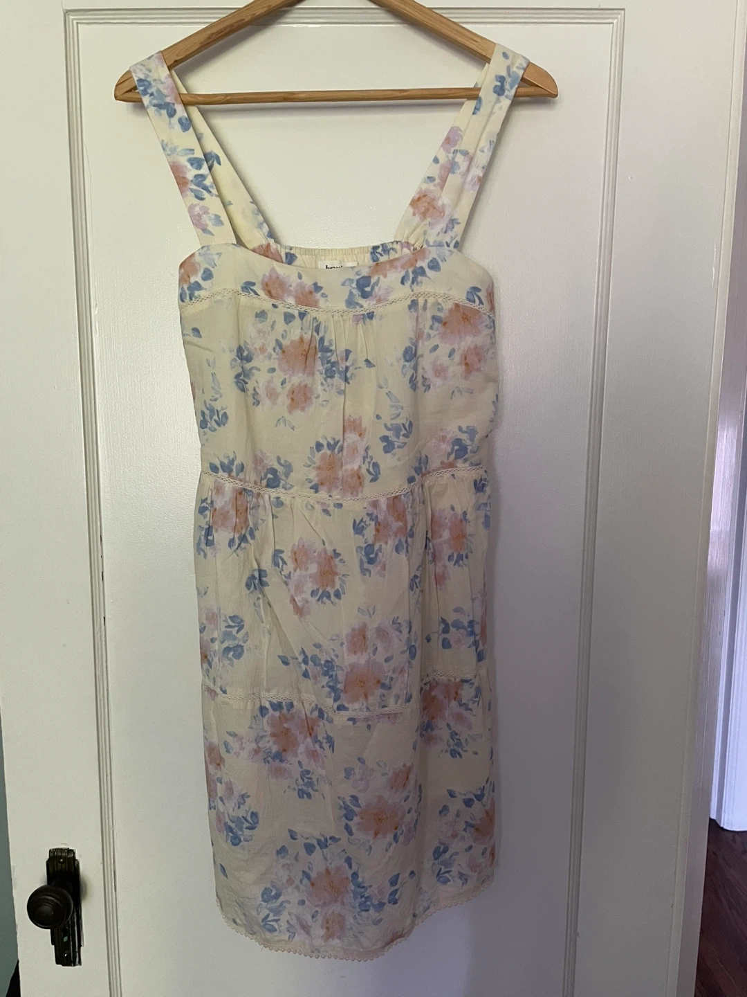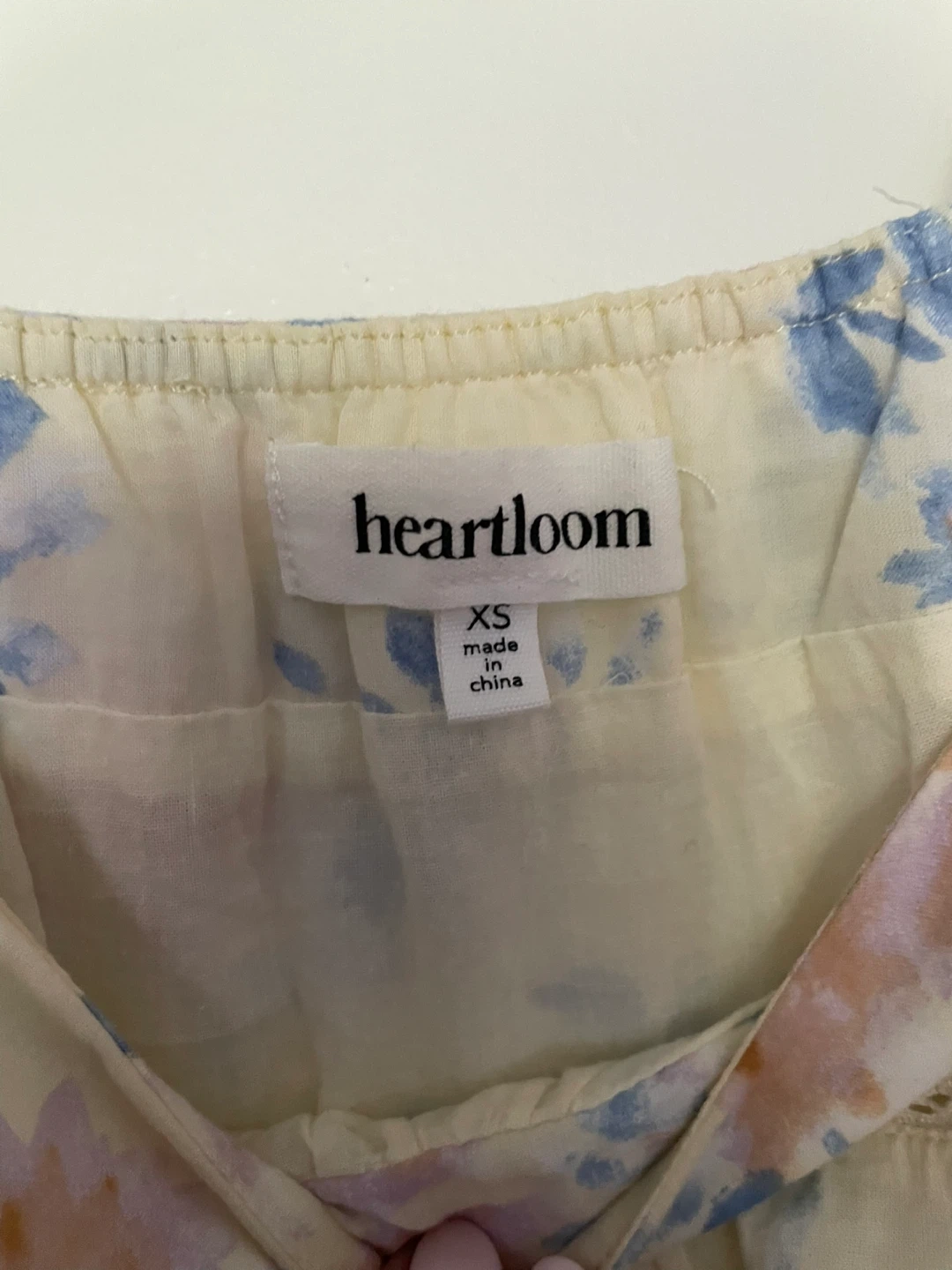 Charming Heartloom mini dress with floral pattern. Features soft cream base with pink and blue flowers. Perfect for a casual outing.