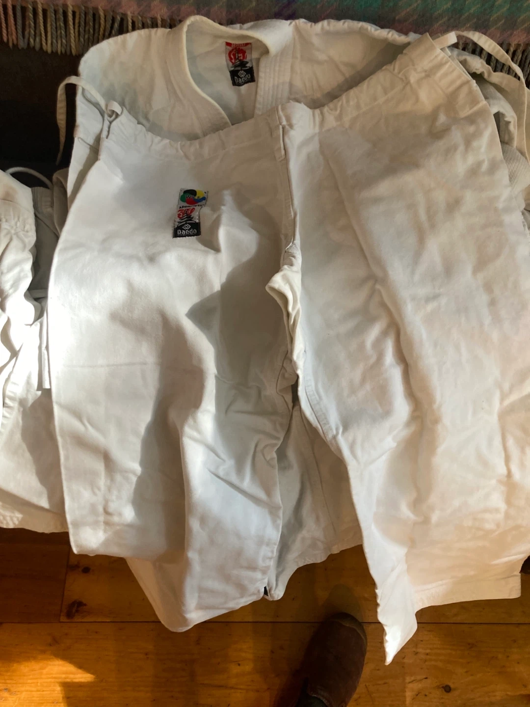 This gi is super heavy weight for that crisp snapping sound when you perform your katas. It is in good condition, and is 100% cotton. the badge is sewn on by hand and can easily be removed.