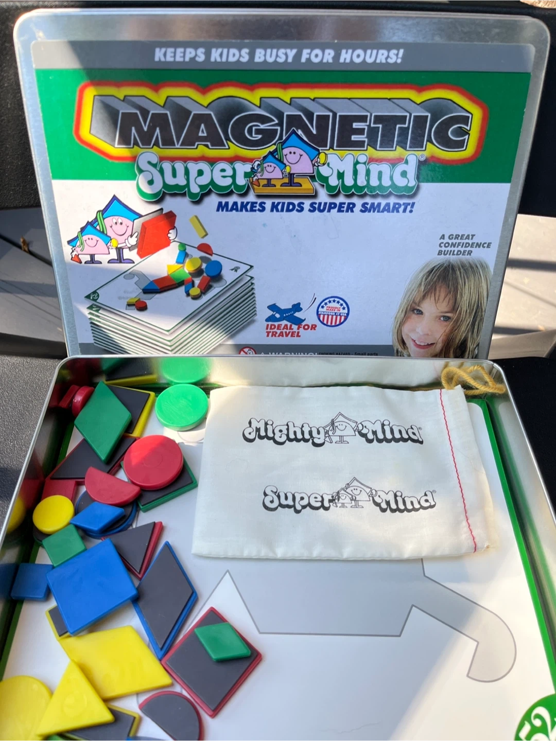 Keep your kids busy for hours with this Magnetic Super Mind game! Ideal for travel. Comes with a variety of colourful magnetic shapes and a travel-friendly case