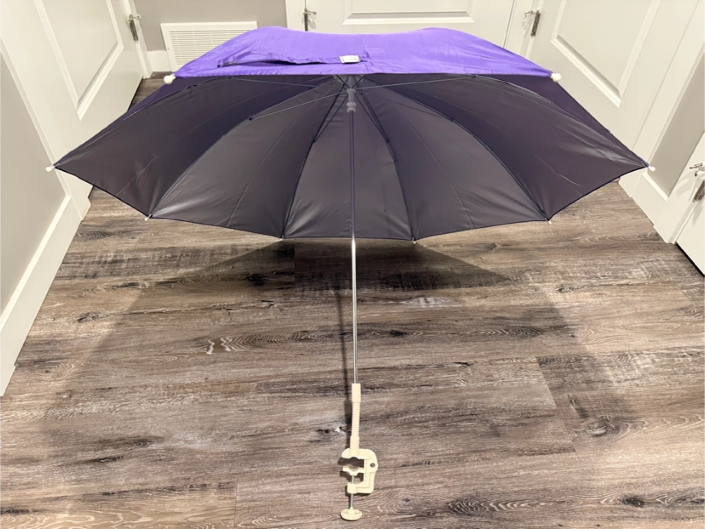 Selling a purple clamp-on umbrella! It's in great shape and ready to provide shade wherever you need it. Perfect for attaching to chairs, strollers, or anything else you can clamp it onto