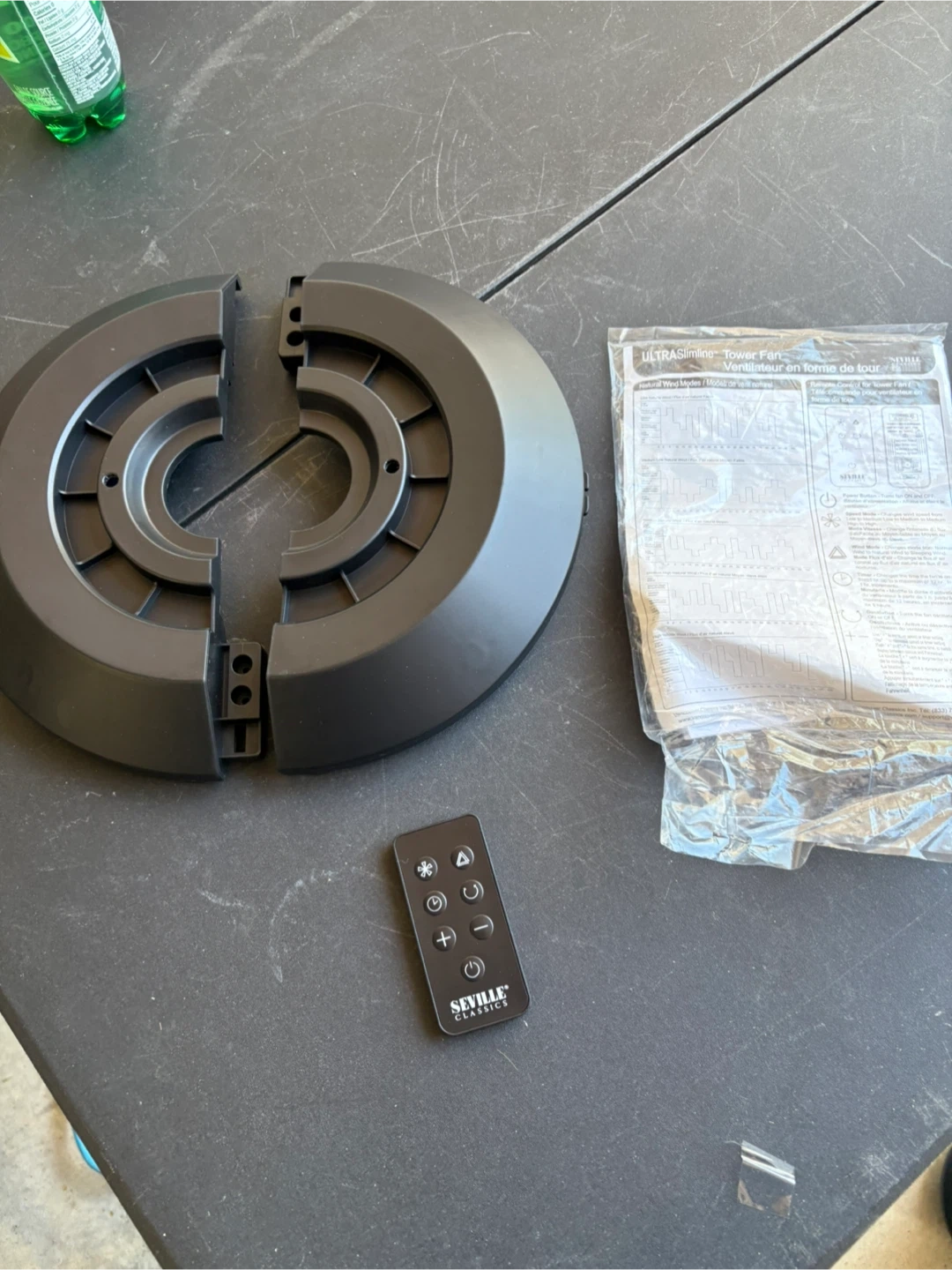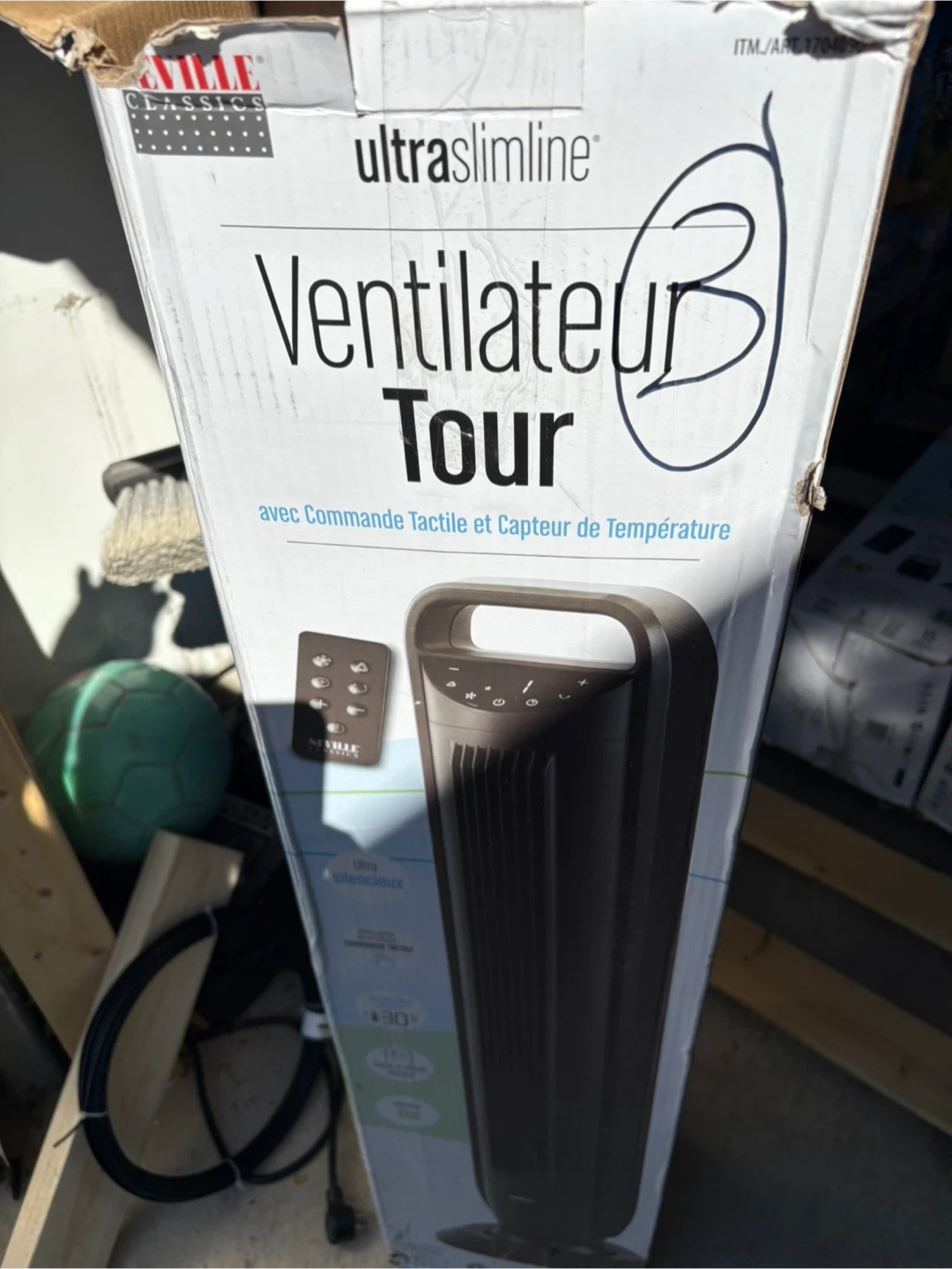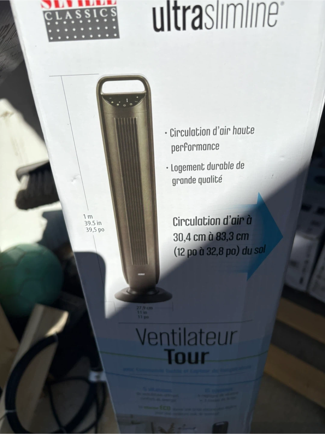 Brand new Seville Classics UltraSlimline tower fan. Comes with box, base stand, remote control, and manual.