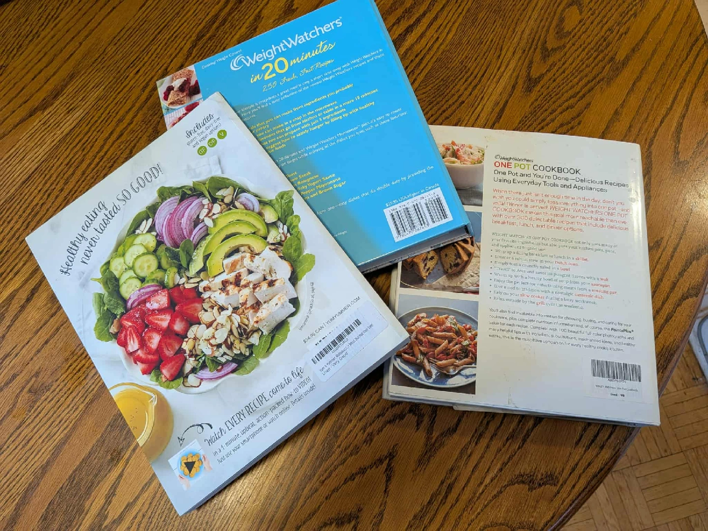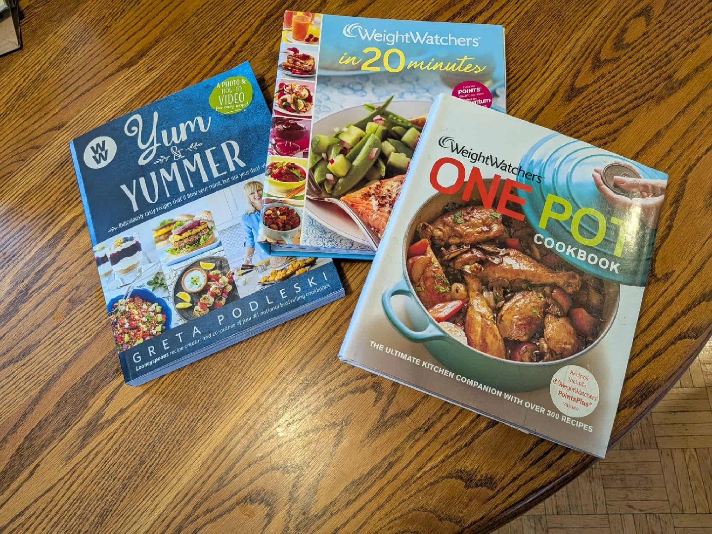 Selling a set of three WeightWatchers cookbooks to help you with healthy and delicious meals! Included are: - Yum & Yummer by Greta Podleski: Features fabulous recipes that'll blow your mind, but not your diet - WeightWatchers in 20 Minutes: Offers 150 fast and fresh recipes - WeightWatchers One Pot Cookbook: The ultimate kitchen companion with over 300 recipes using everyday tools and appliances These books are perfect for anyone looking for easy and healthy meal ideas