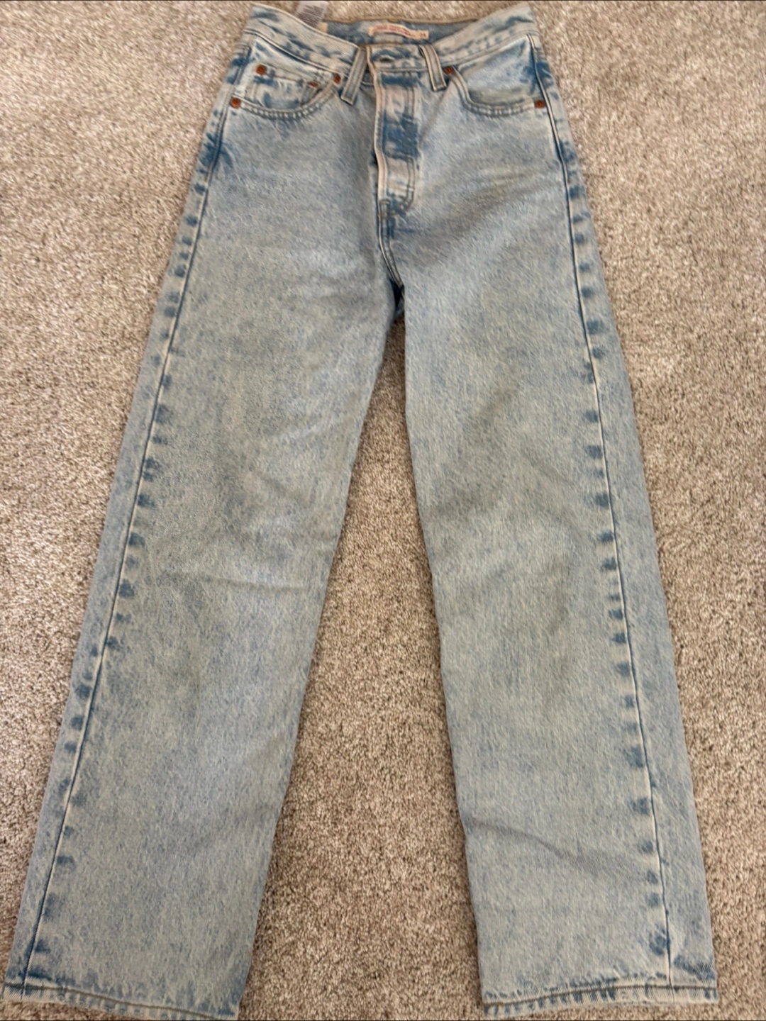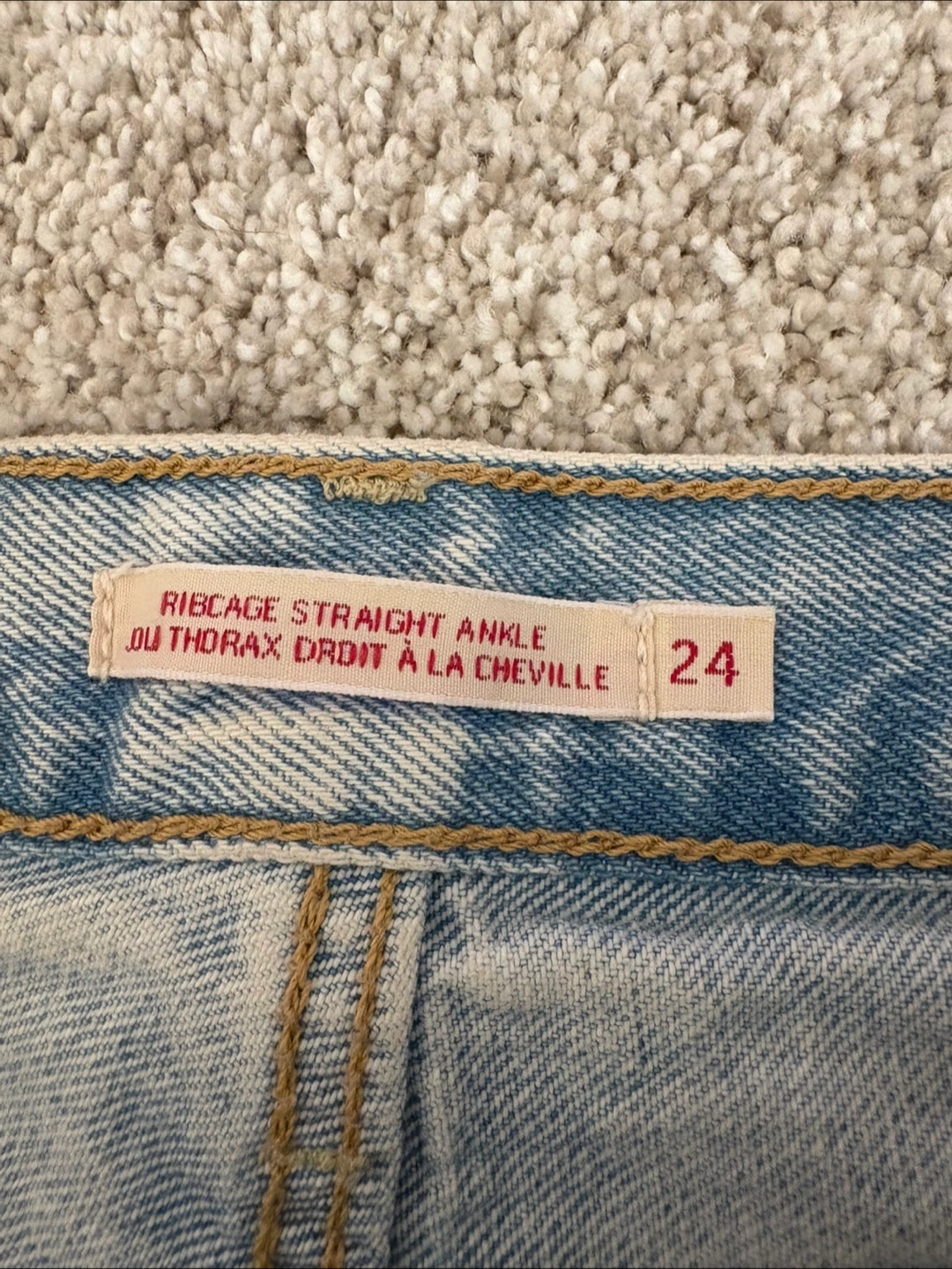 Selling a pair of Levi's Ribcage Straight Ankle jeans! They are a size 24 and in great condition. These jeans feature a flattering high waist and a straight leg, perfect for any casual outfit