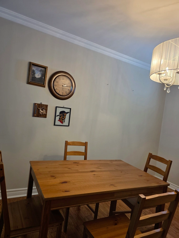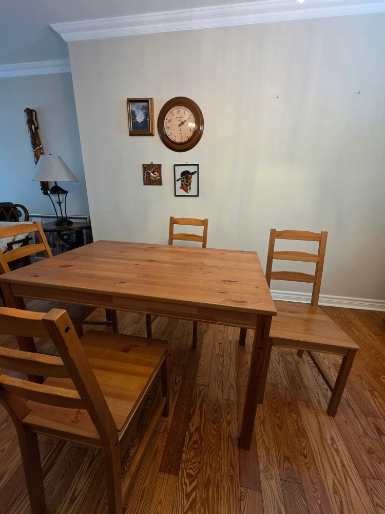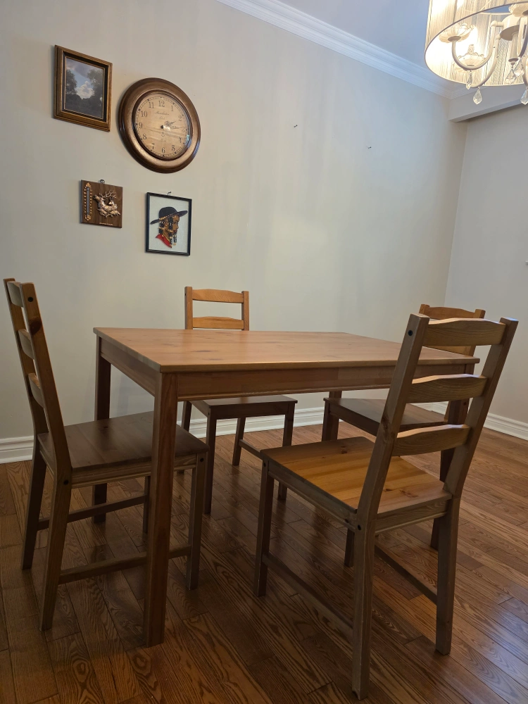 Selling dining table with four matching chairs. It's in good condition and ready for a new home! Perfect for a small family or apartment. The set has a natural wood finish.