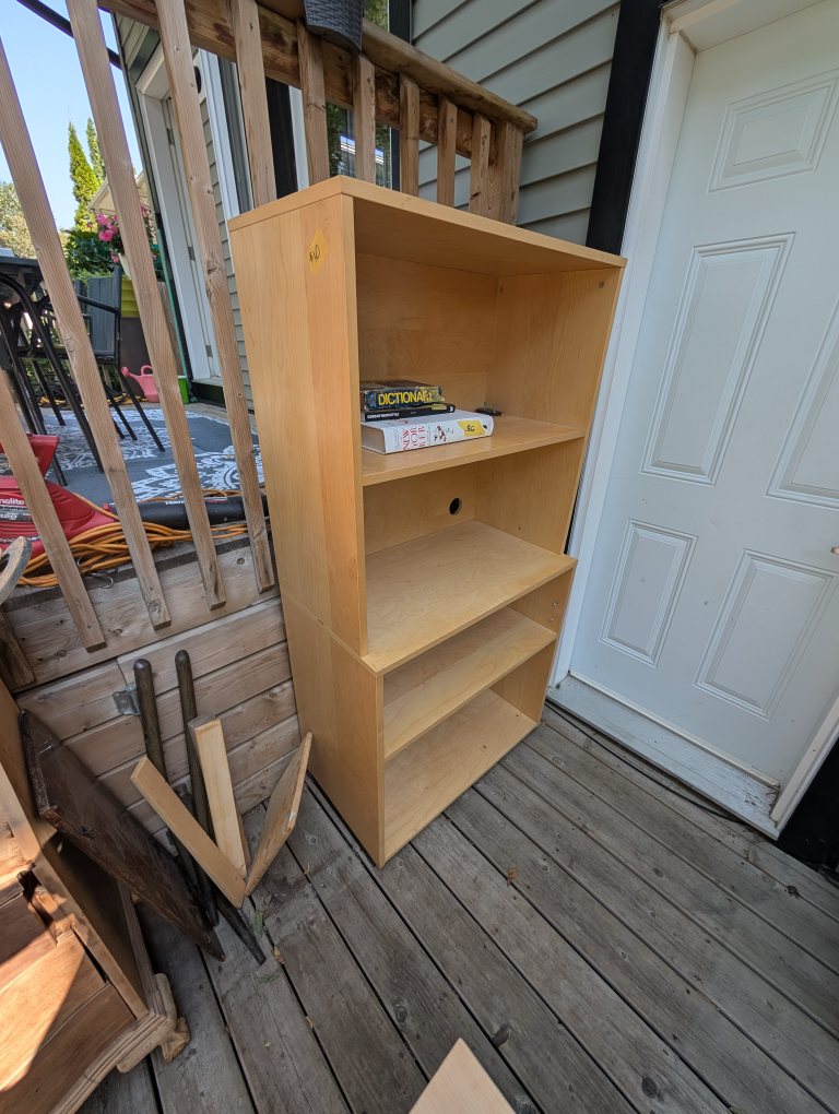 Solid, strong birch plywood bookcase. It has four shelves with acess for wires. Some wear and tear so maybe not the best living room shelf, but it's been fantastic extra storage in the garage/basement.