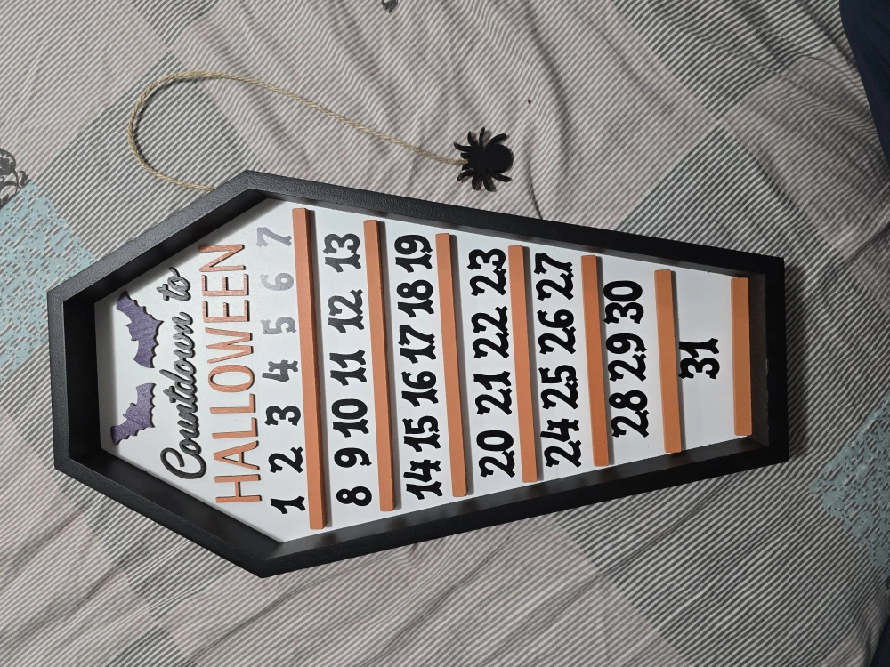 54Get ready for spooky season with this Halloween countdown sign! It's shaped like a coffin and has numbers to count down the days until Halloween. Perfect for adding a festive touch to your home