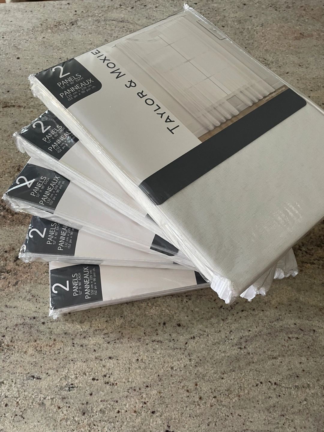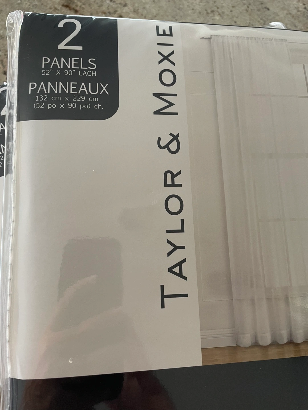 I have several sets of Taylor & Moxie Cosmo White curtains for sale. Each package contains two panels, and each panel measures 52" x 90" (132 cm x 229 cm). They are made of 100% polyester and are machine washable. Perfect for adding a light and airy touch to any room!