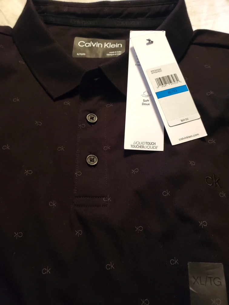 I'm selling a Brand New Calvin Klein polo shirt, size XL. It's black with a subtle 'ck' pattern. The tag is still attached. It's a soft, comfortable material. Originally bought for $69!