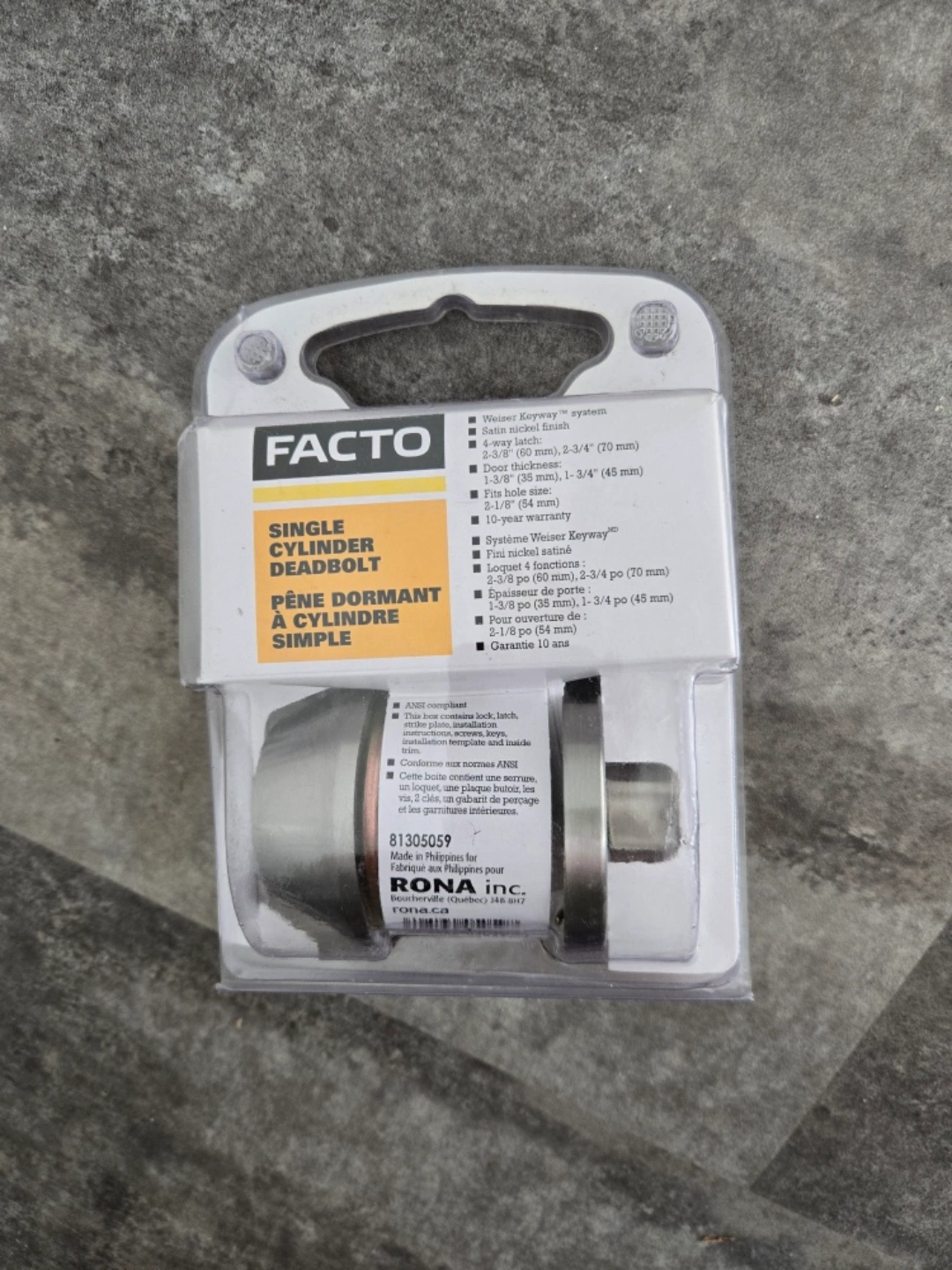 Selling a brand new Facto single cylinder deadbolt in satin nickel finish. It's still in its original packaging and comes with all the necessary components for installation. Package was opened but nothing missing.