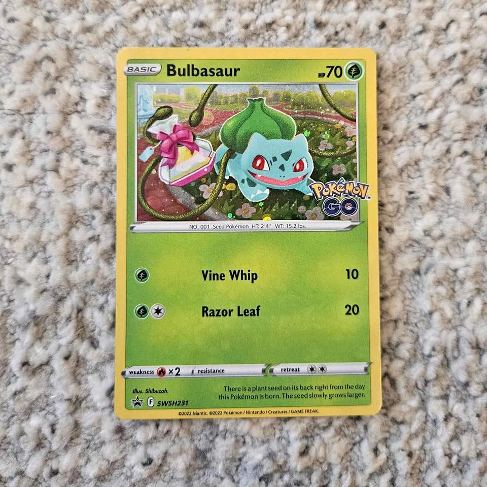 This cute Bulbasaur is a promo card from the Sword and Shield Pokemon GO set.