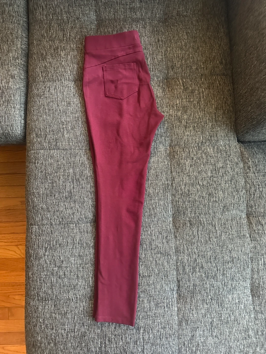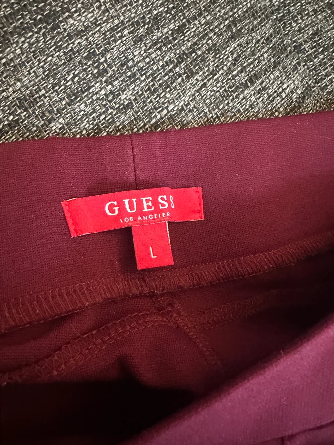 Check out these stylish Guess leggings in a rich burgundy colour, size large. They feature faux leather accents and handy front zipper details. Never used, just like new! Specifics: * Brand: Guess * Size: Large * Colour: Burgundy with faux leather accents * Details: Front zipper details, faux leather accents