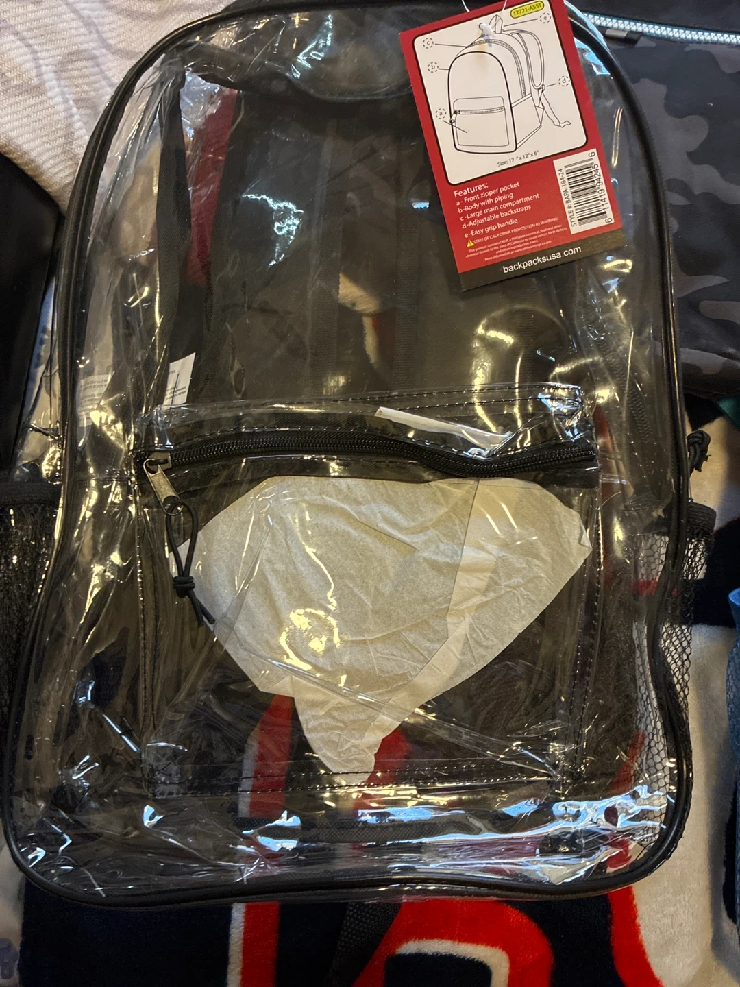 Selling a clear backpack that's perfect for school or work! It's brand new with tags. Features include: - Front zipper pocket - Body with piping - Large main compartment - Adjustable backstraps - Easy grip handle The size is 17" x 12" x 6"