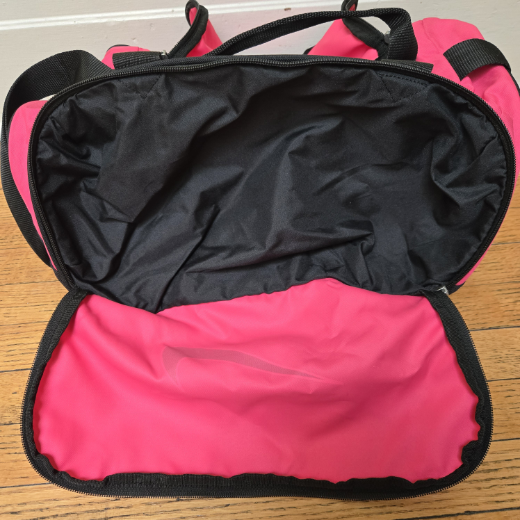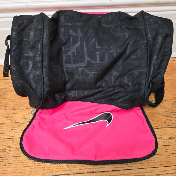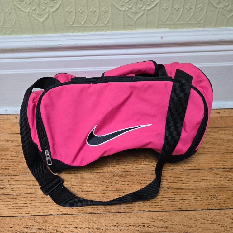 Selling a cute Nike duffle bag! It's pink and black, perfect for the gym or a weekend getaway. It has a spacious interior and a shoulder strap for easy carrying