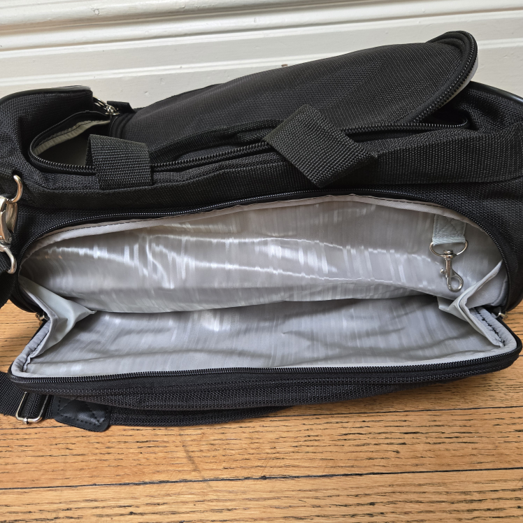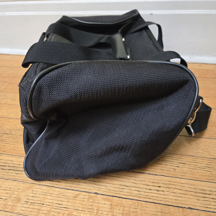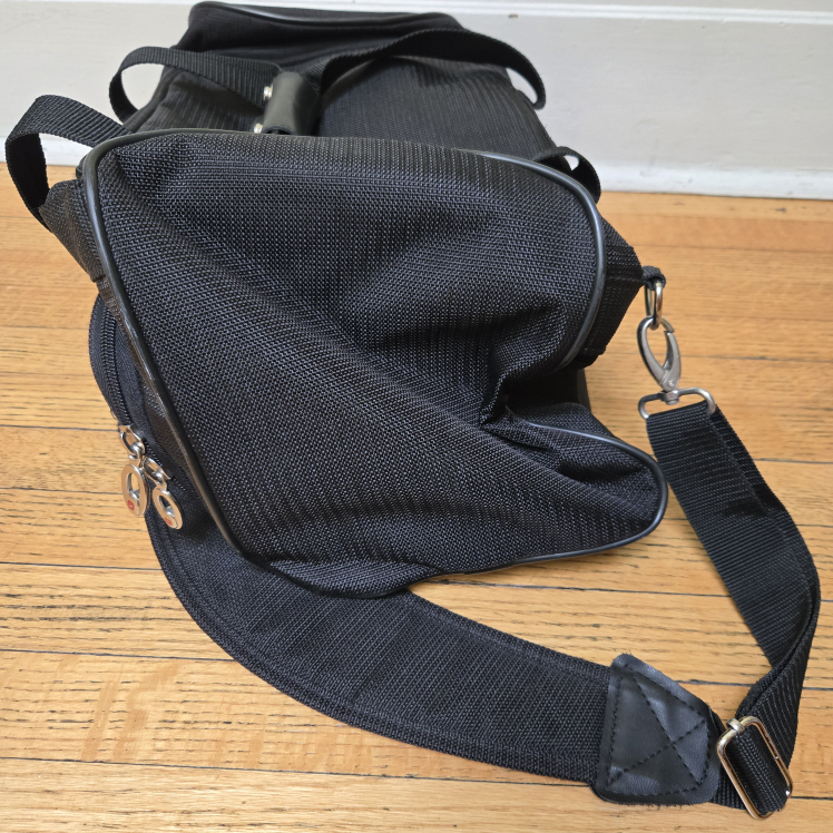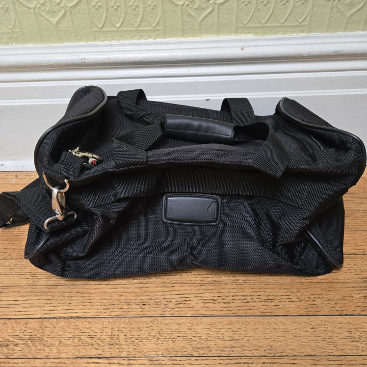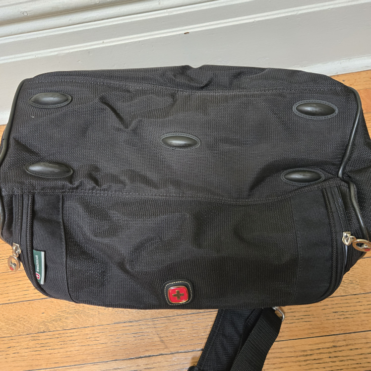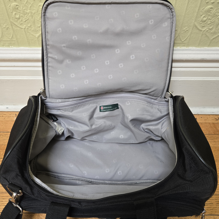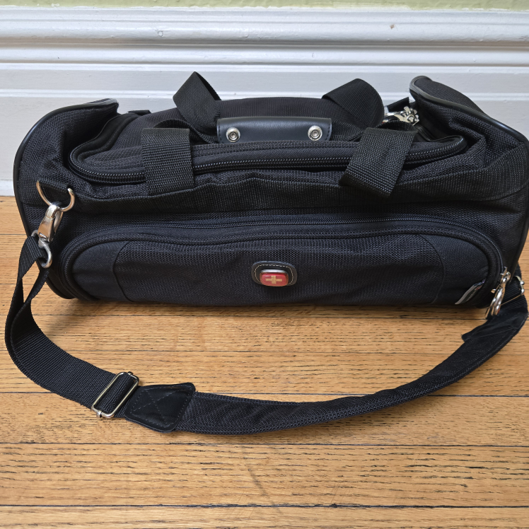 Here's a Swiss Gear Wenger duffel bag in black. It's perfect for travel or hitting the gym. It has lots of space inside and a shoulder strap for easy carrying.