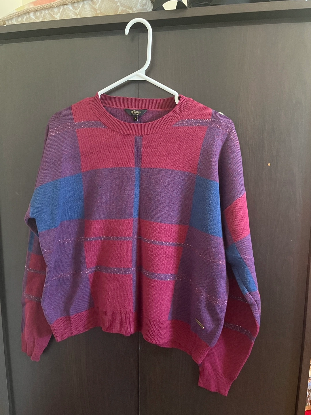 Here's a Part Two sweater in size M! It features a colourful plaid pattern in shades of pink, purple, and blue. It's a cozy and stylish piece to add to your wardrobe