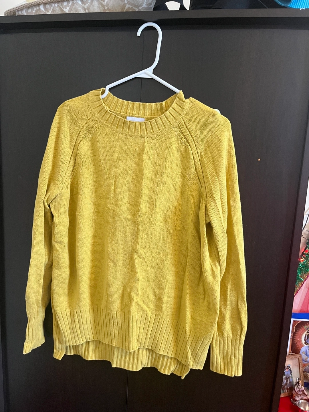 Here's a comfy yellow crew neck sweater! It's in great condition and would be a perfect addition to your wardrobe for those cooler days. The material feels soft and cozy, making it ideal for everyday wear