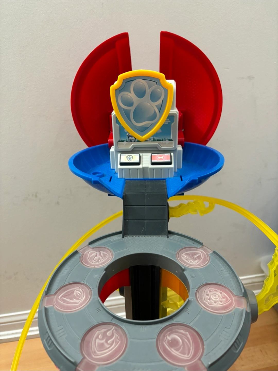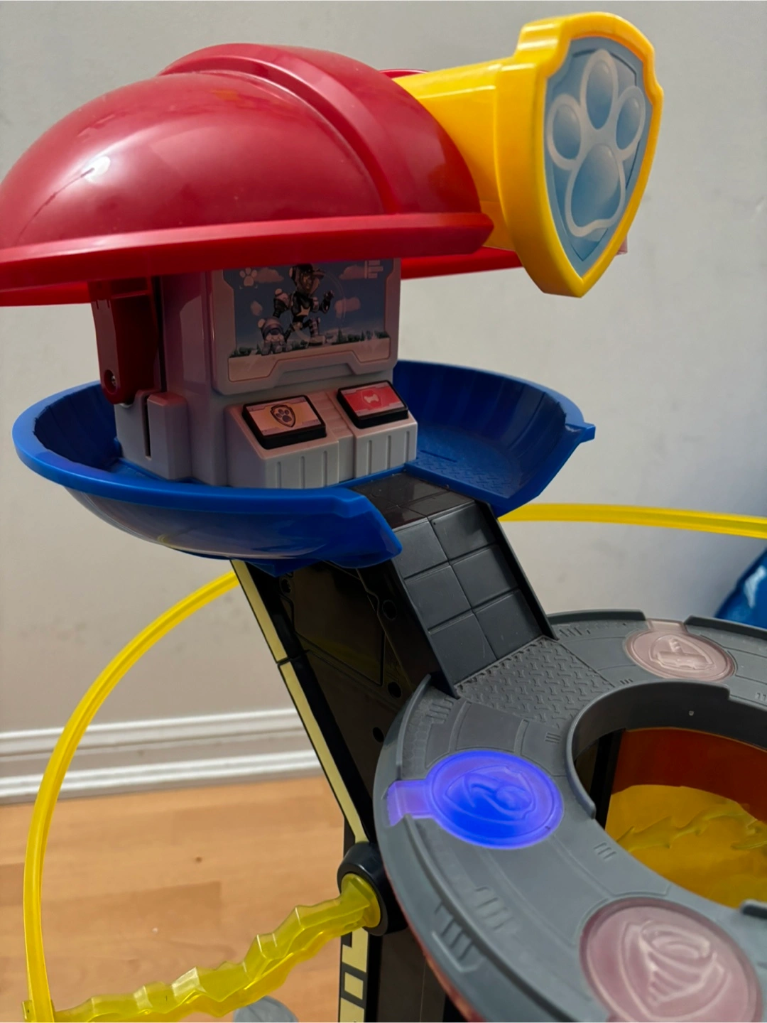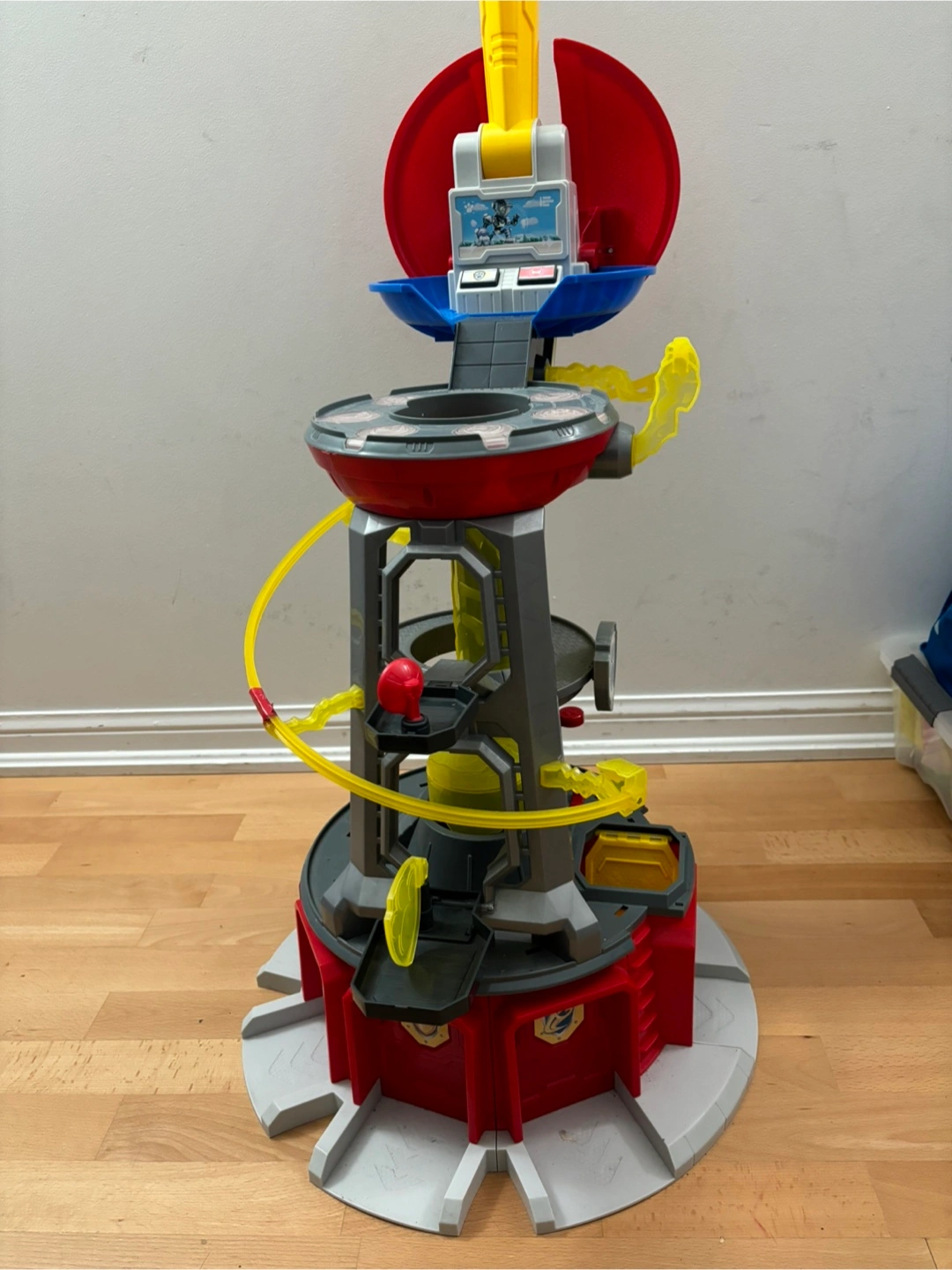 Paw Patrol Lookout Tower Musical playset! It's in great condition and ready for a new home. Features include elevator, trap door, parking for all pups’ vehicles, meteor flap and bendable microphone (dummy).