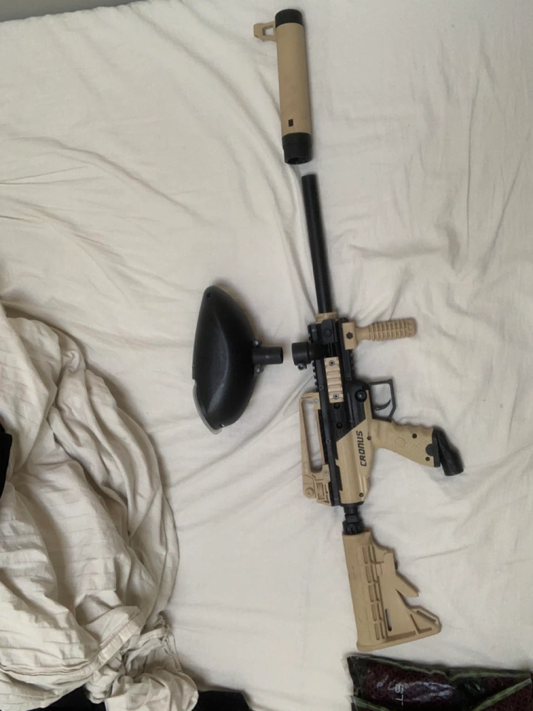 Selling a Tippmann Cronus paintball marker. It appears to be in good condition and comes with a hopper, tank, and some paintballs. Ready for some outdoor fun!
