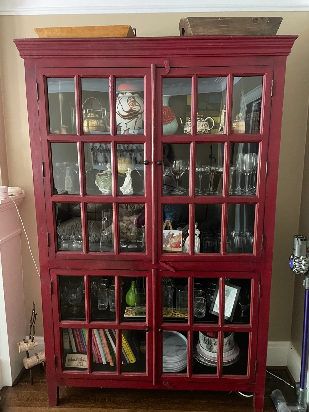 Selling a lovely red display cabinet! It's perfect for showcasing your favourite items, from glassware to books. It has a rustic, charming look that would fit well in many homes