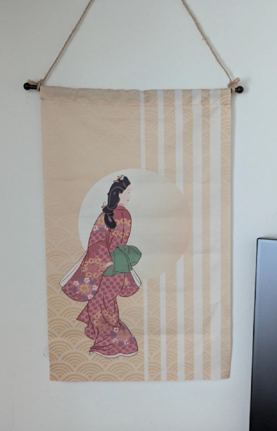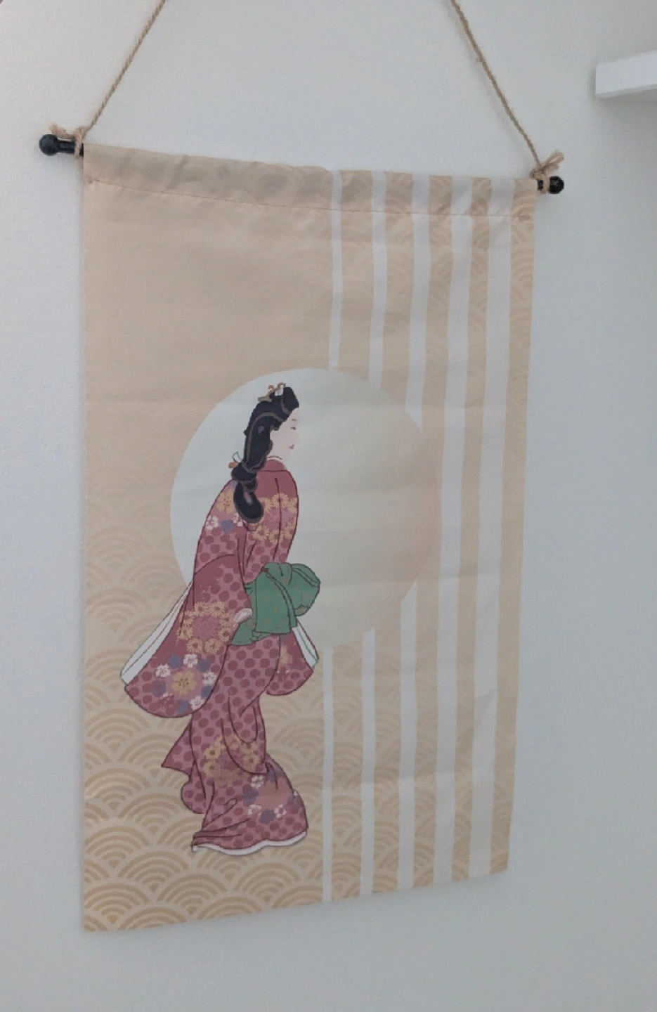 This is a small wall hanging scroll featuring a Japanese geisha. It has a beige and pink colour scheme and comes with a hanging string.