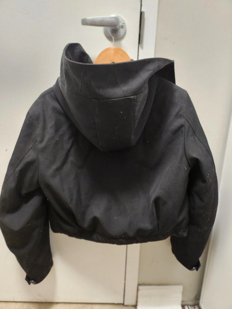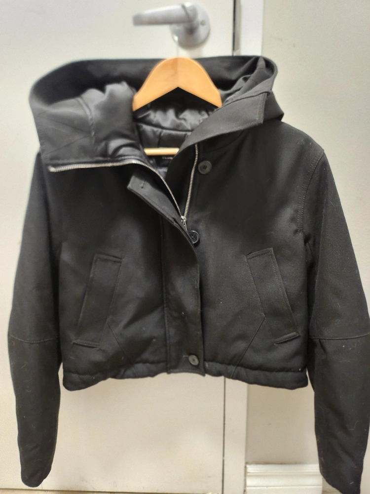 Selling a Club Monaco cropped parka in black. It's a size small and in great condition. The tag shows it was originally bought for $548. It's a stylish and cozy jacket, perfect for the cooler weather!