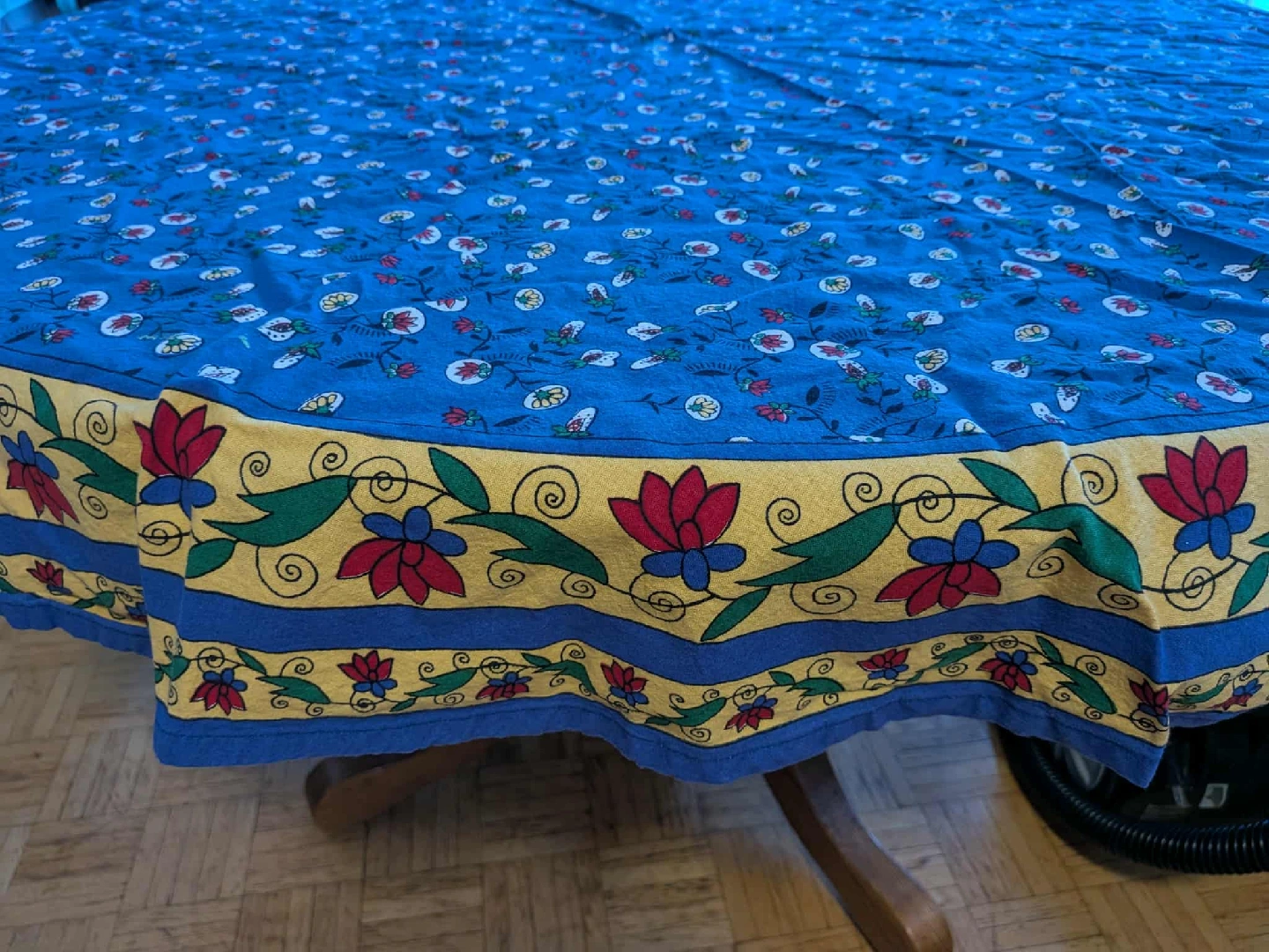 I'm selling a lovely floral print tablecloth, perfect for adding a touch of colour to your dining room or kitchen! The tablecloth features a beautiful blue background with a vibrant yellow border adorned with floral patterns. It's in great condition and ready to brighten up your space