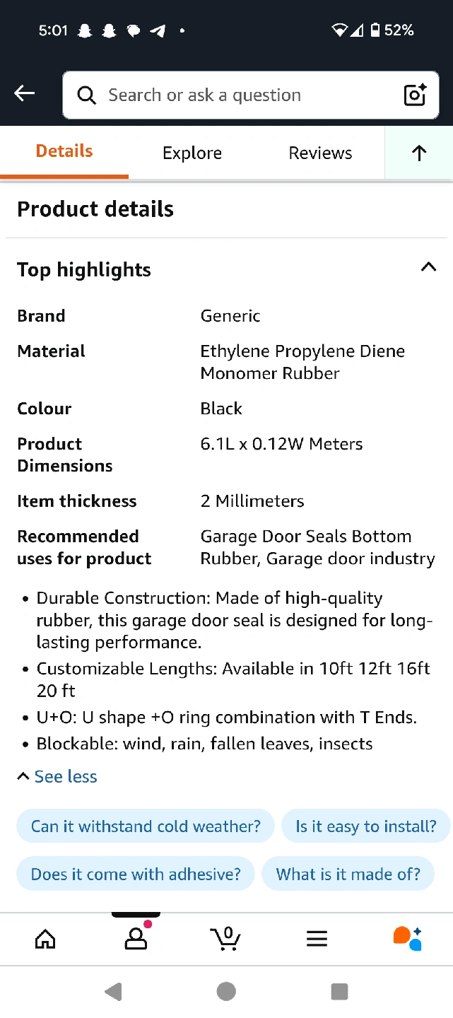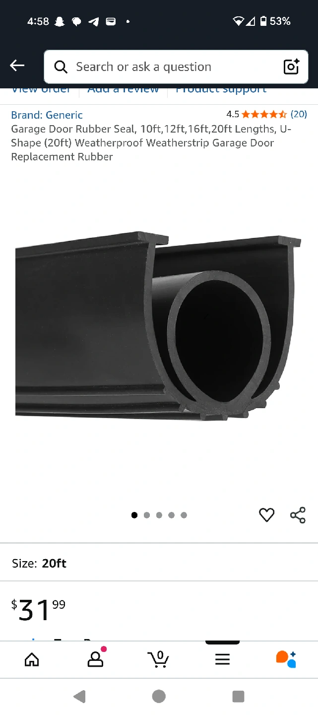 Selling a 20ft garage door rubber seal in black. This seal is U+O shaped with T ends, making it blockable against wind, rain, fallen leaves, and insects. Dimensions are 6.1L x 0.12W meters, with an item thickness of 2 millimeters. Brand new - still in box (I bought the wrong size)